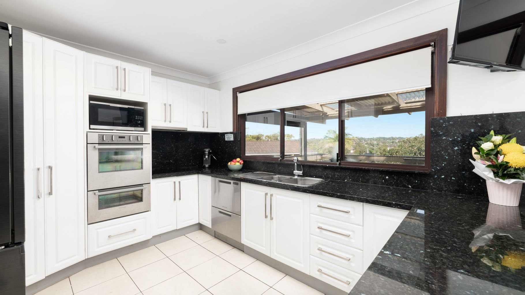 - Well appointed and spacious kitchen featuring premium stainless steel appliances, expansive double width stone benchtops, a breakfast bar, and an abundance of cupboard and bench space.