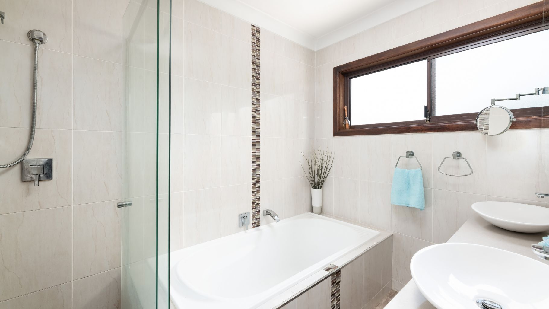- Modern and fully tiled bathroom showcases a double floating vanity, freestanding basins, mirrored cabinetry, separate bath and shower, and ample linen storage.