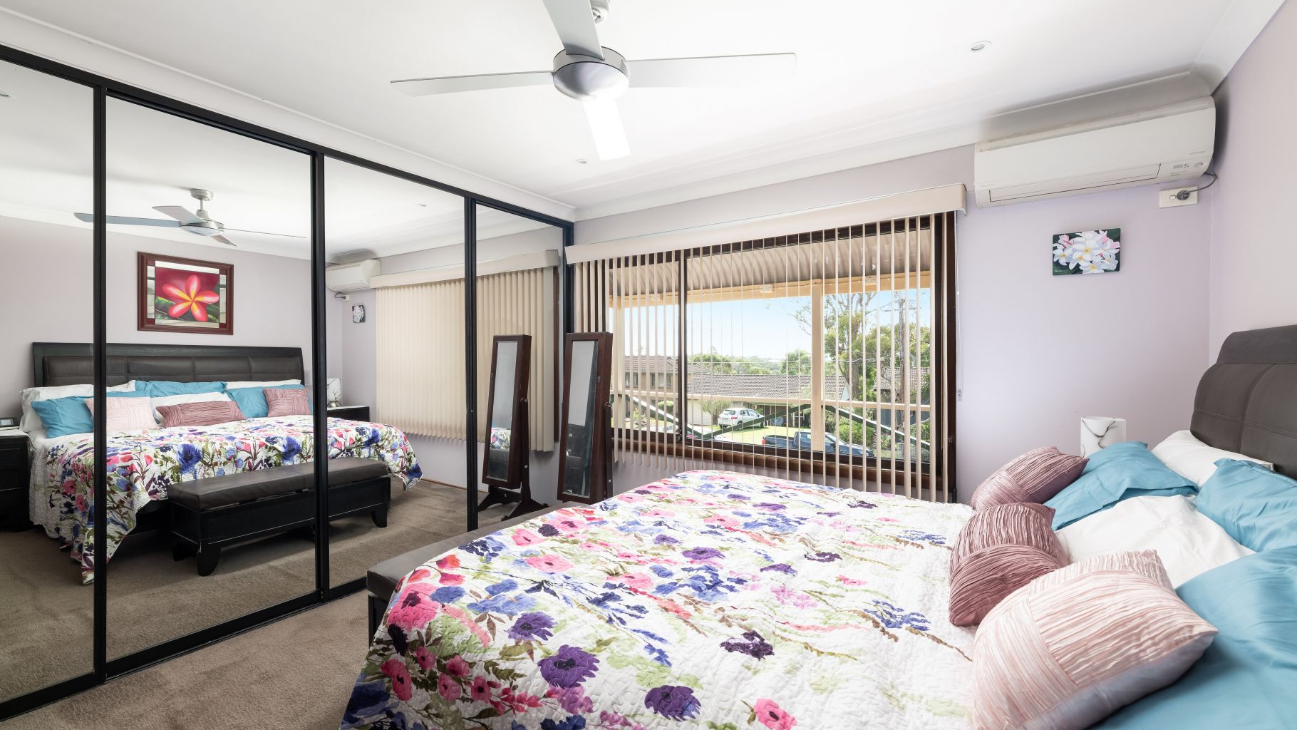 - Four generously sized bedrooms, each with large mirrored built in wardrobes; one includes a built in study nook, and the master enjoys split system air conditioning.