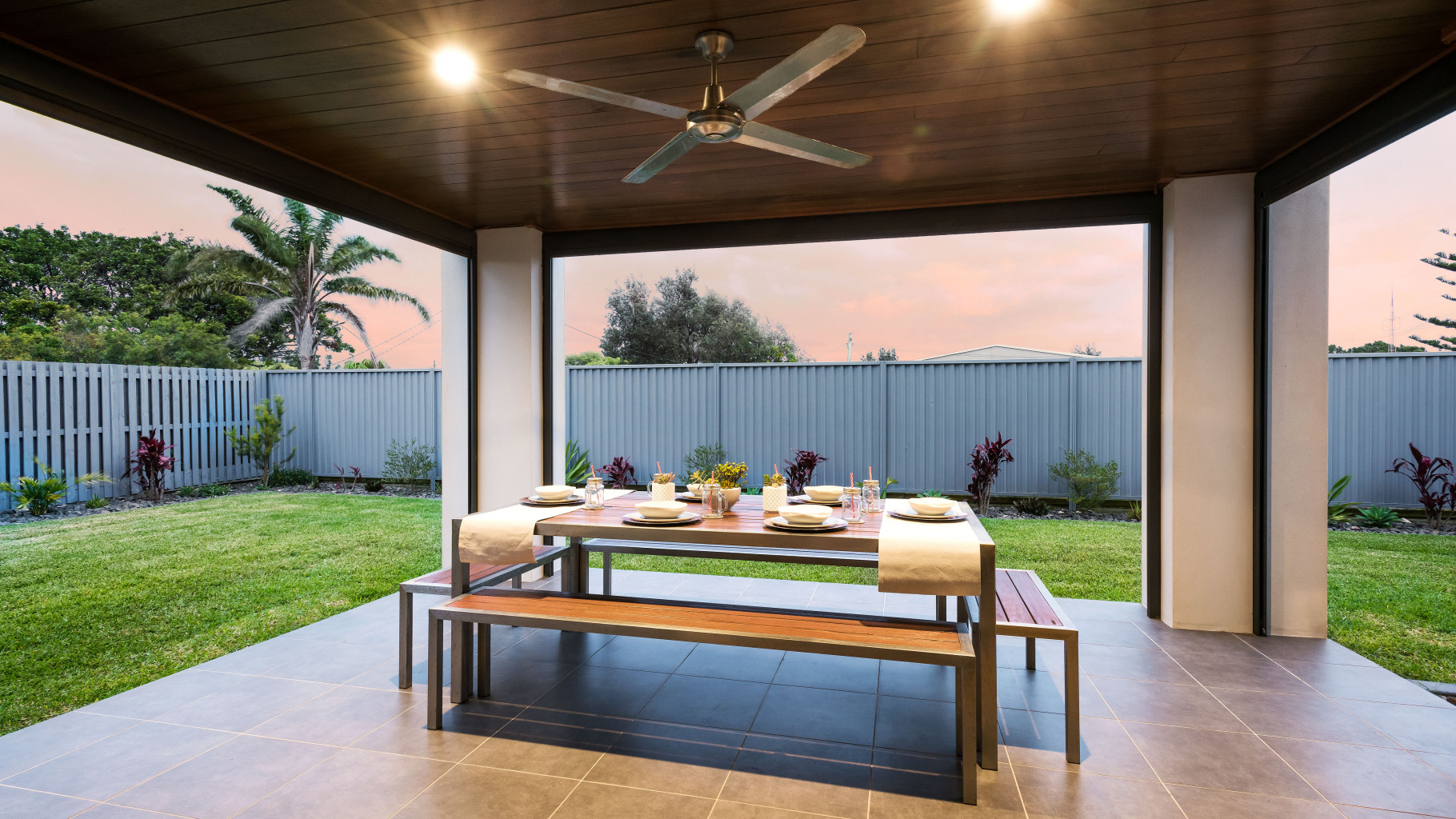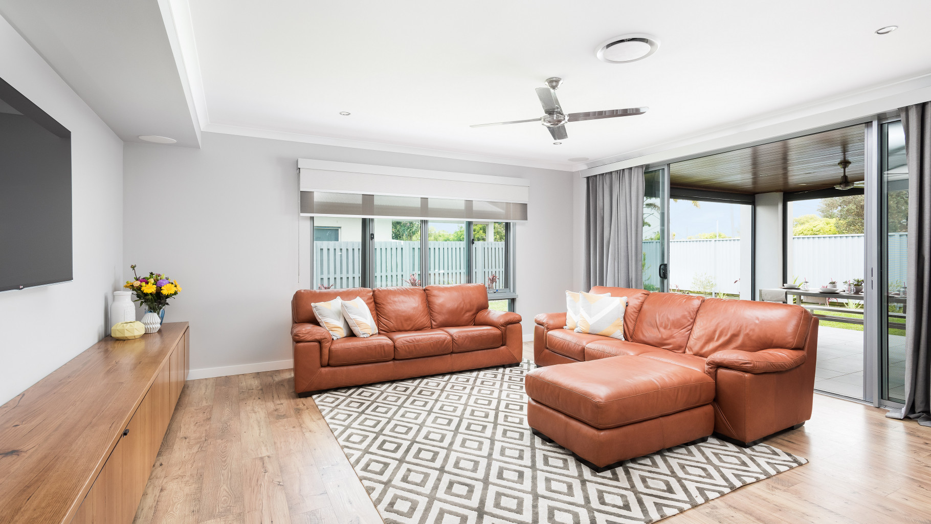 - Generous and open plan living room with quickstep flooring, integrated Tasmanian oak entertainment unit, stainless steel ceiling fan and surround sound system flowing to the alfresco area