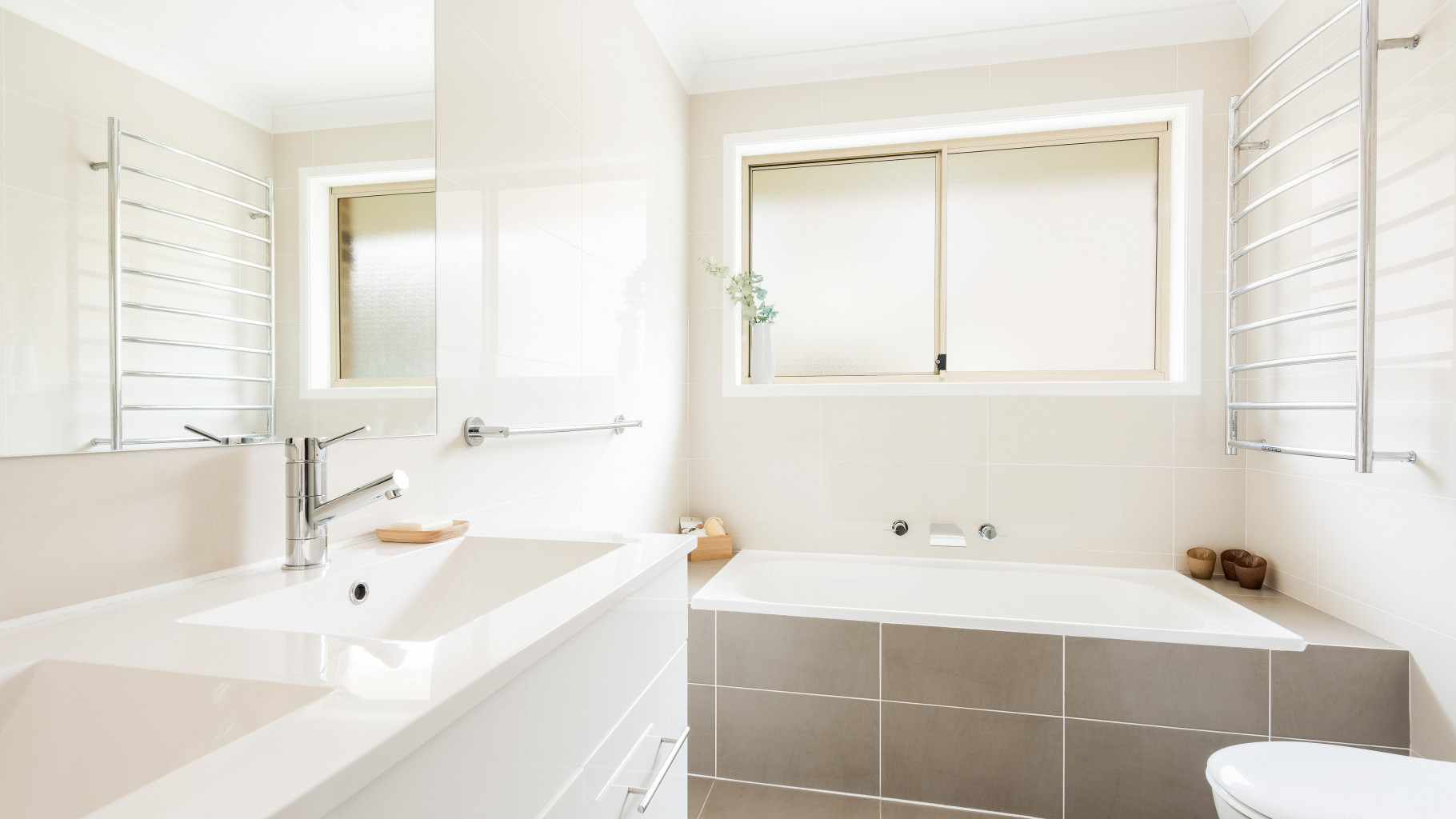 - Main bathroom with quality fittings, bath, 10 tier towel rack, twin sink vanity and frameless glass shower