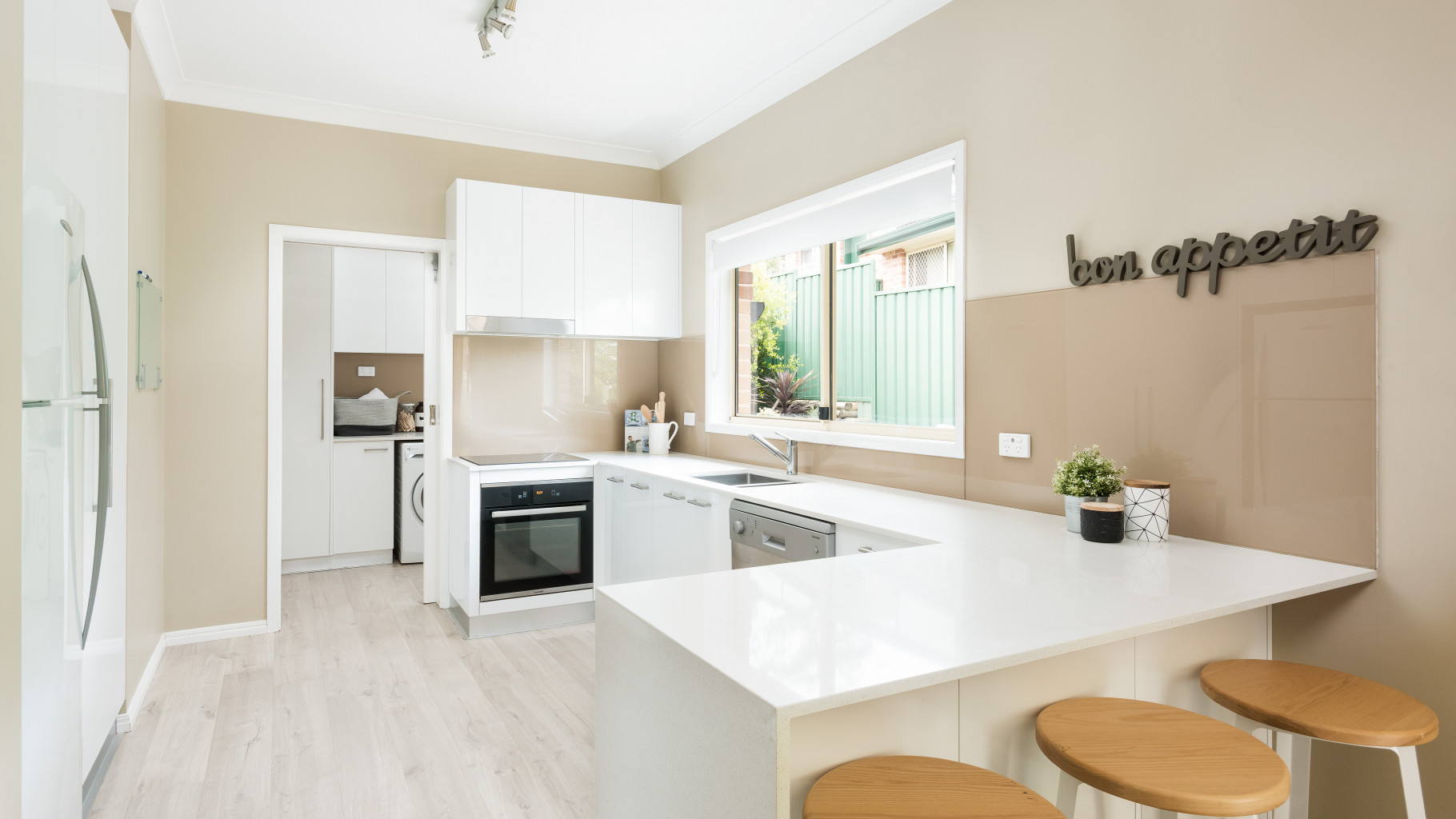 - Laundry with Caesar stone bench top, large sink, ample storage, pet door and access to yard