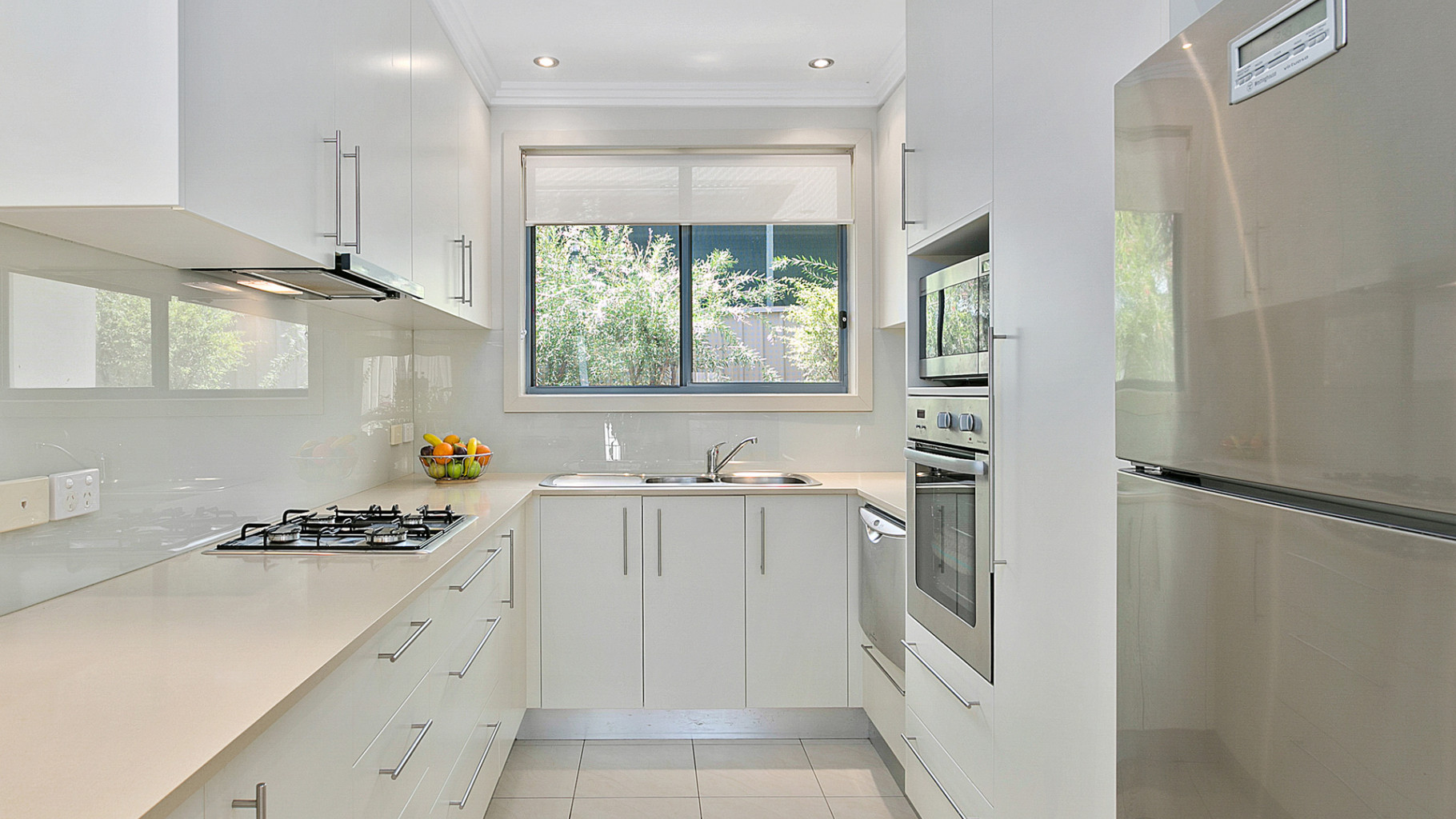 - Practical kitchen features tiled flooring, stone benchtops, ducted air-conditioning, gas cooktop, electric oven, and ample cupboard storage