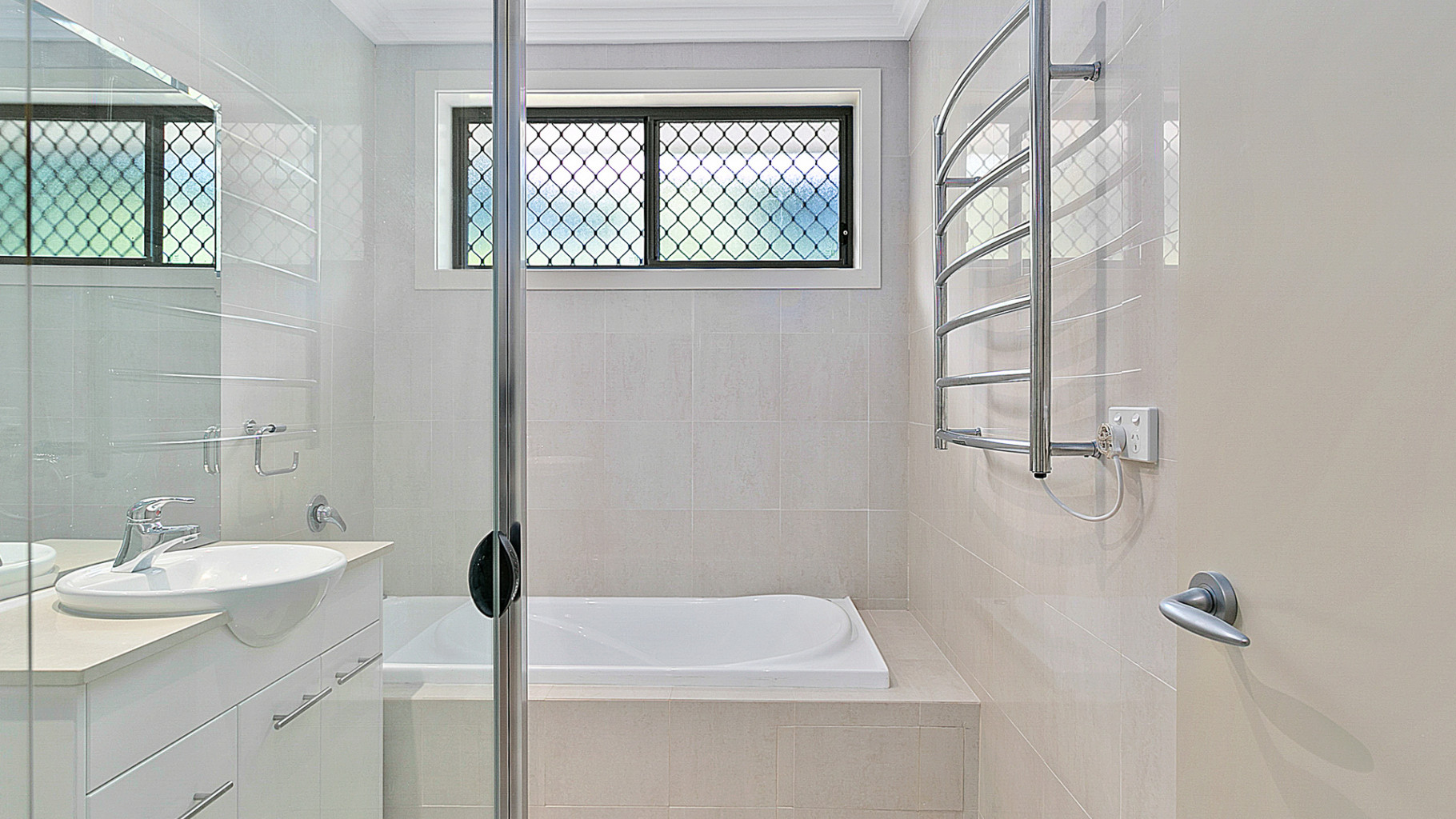 - Spacious bathroom with separate shower to bath, floor to ceiling tiling, heated towel rack and gas hot water