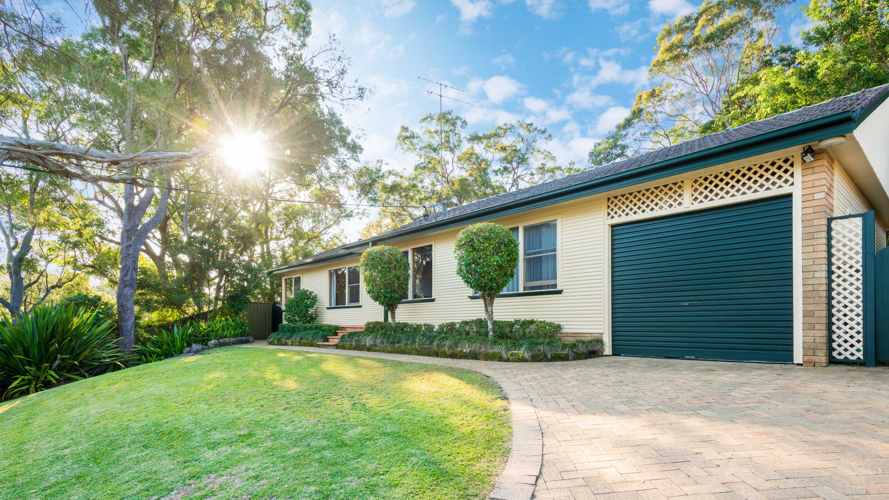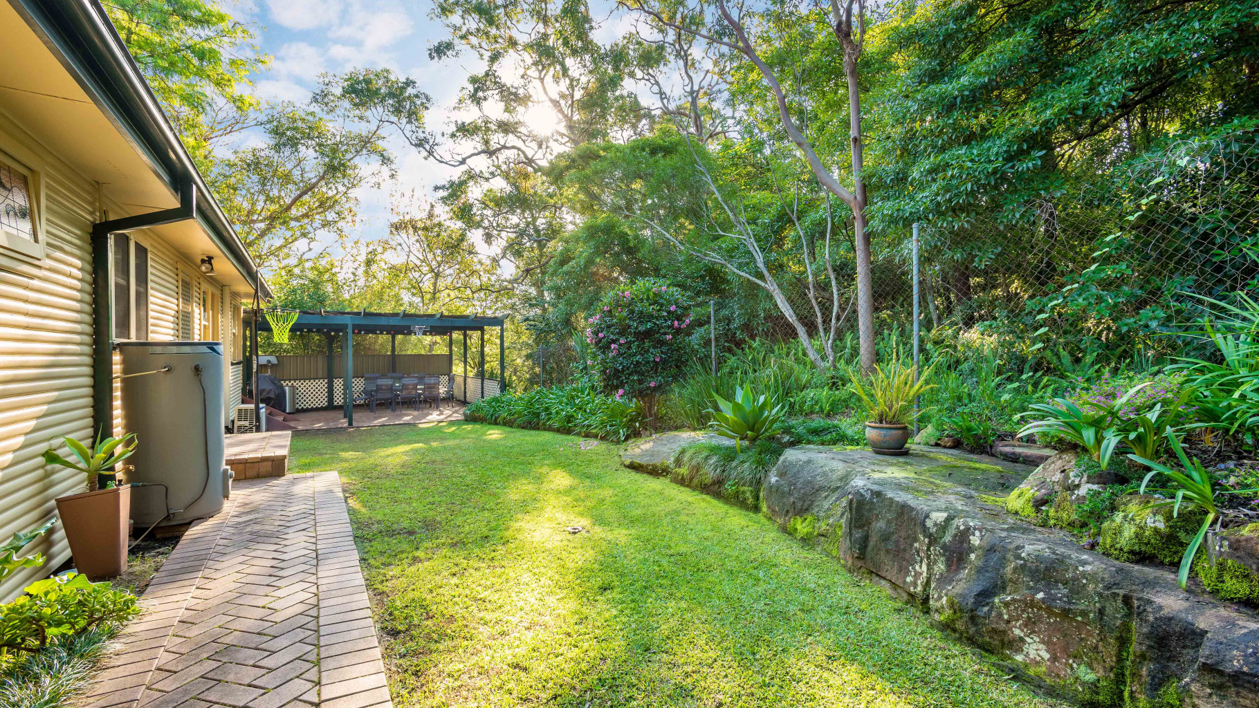 - Private and peaceful covered paved entertaining area overlooks the level grassed lawn and lovely natural sandstone features and manicured gardens