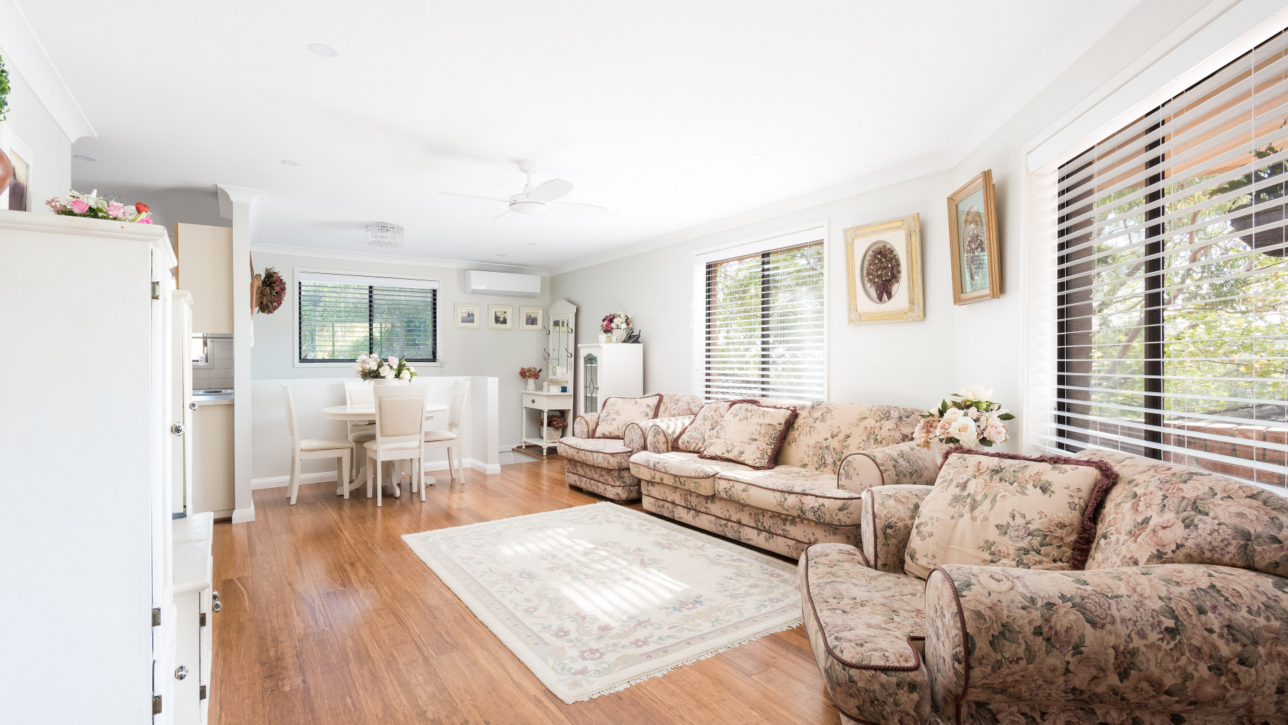 - Combined living and dining area is enhanced by timber floors and air conditioning