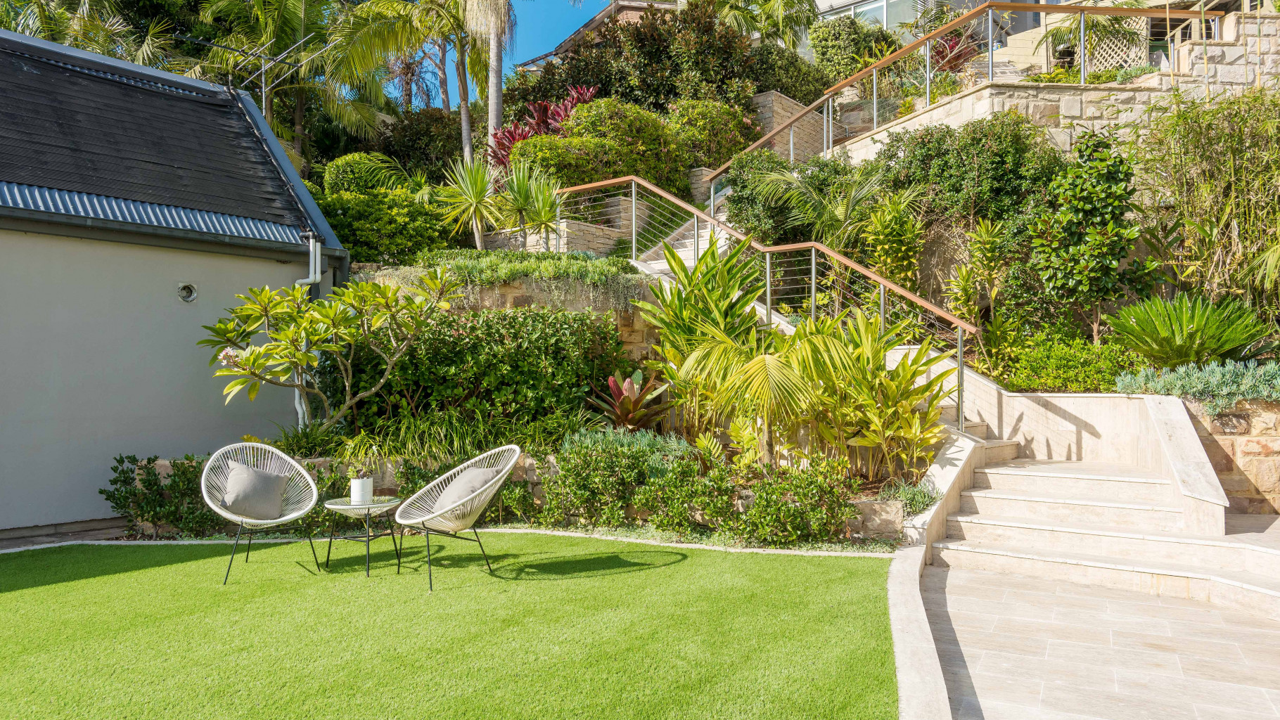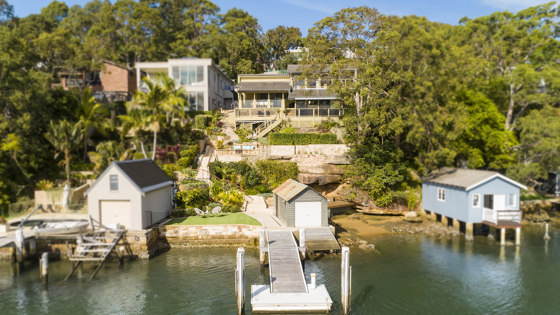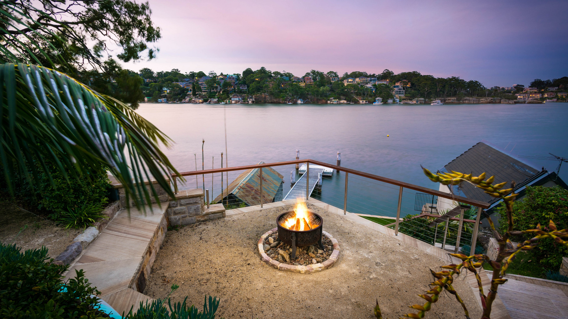 - As you make your way from the residence down through the stone paved staircase & manicured gardens, you'll find the fire pit, flat grassed area, & river side deck. Beyond this are the boat shed, boat ramp, jetty & pontoon