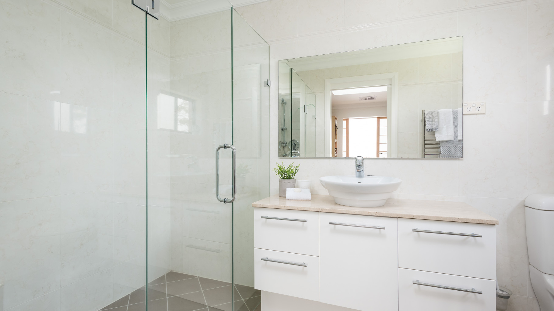 - Central main bathroom tiled floor to ceiling, with shower & water closet