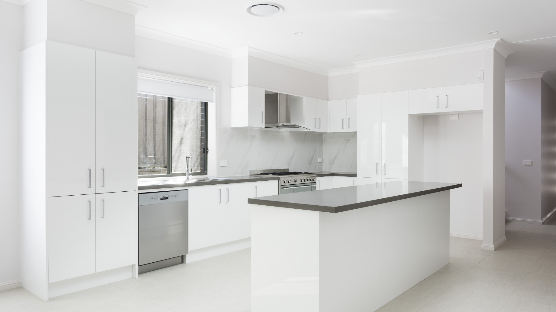 - Contemporary kitchen with gas cooking, dishwasher and island bench