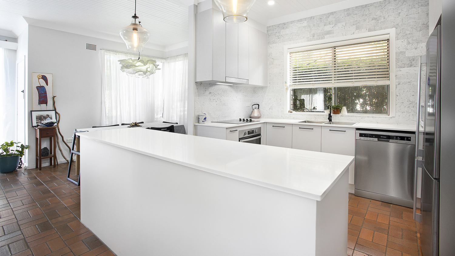 - Renovated kitchen is a display of appealing tones with dishwasher and island bench