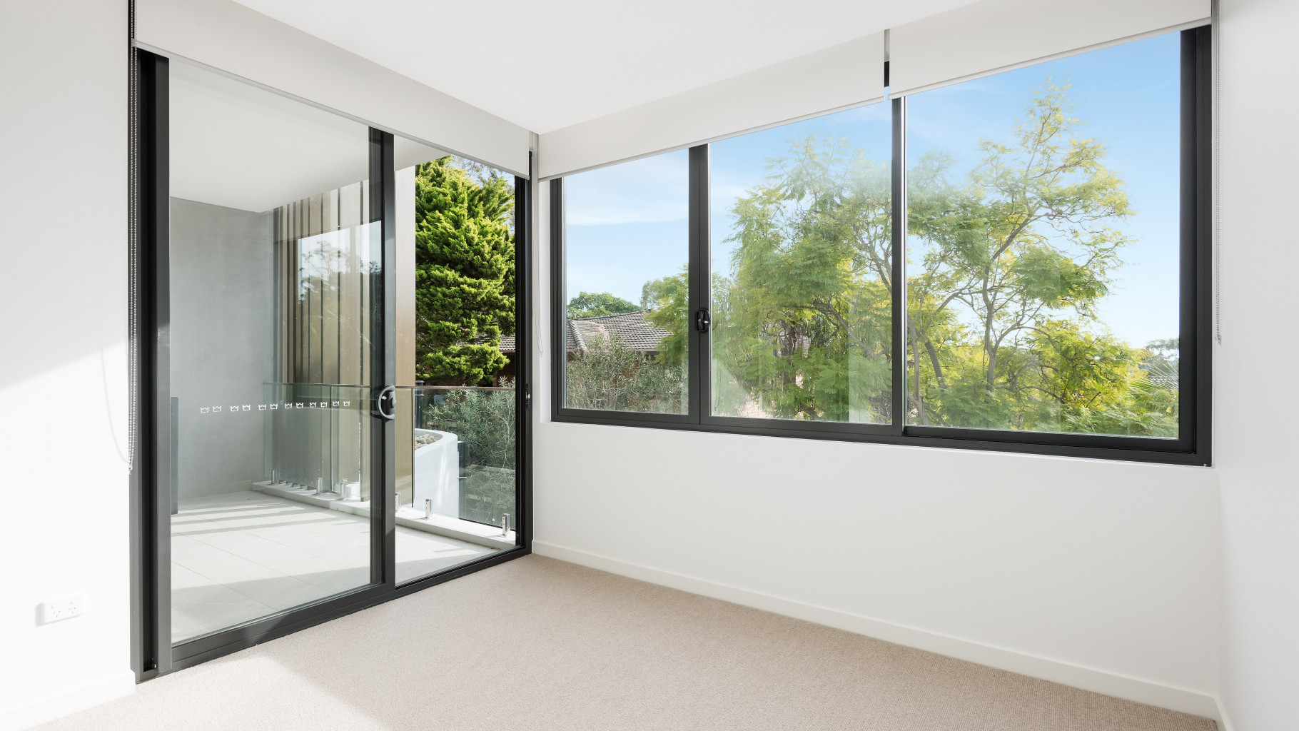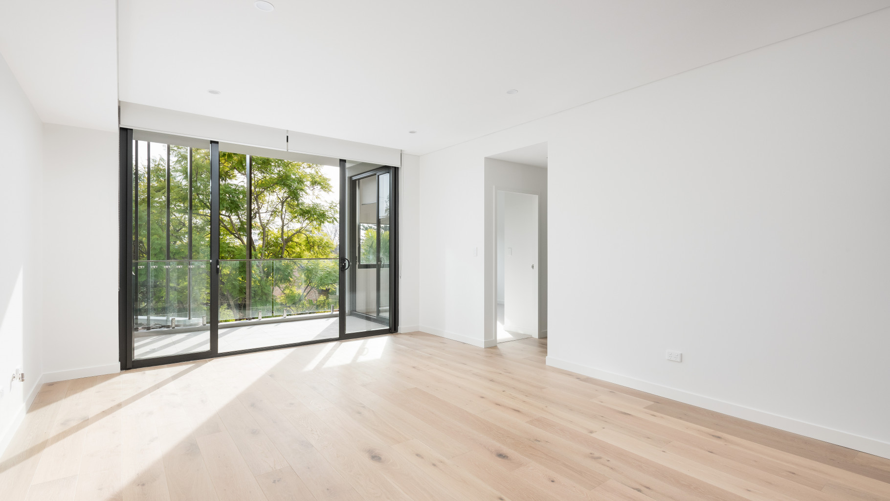 - Sophisticated open plan living area with timber floors, opening to covered balcony with leafy outlook