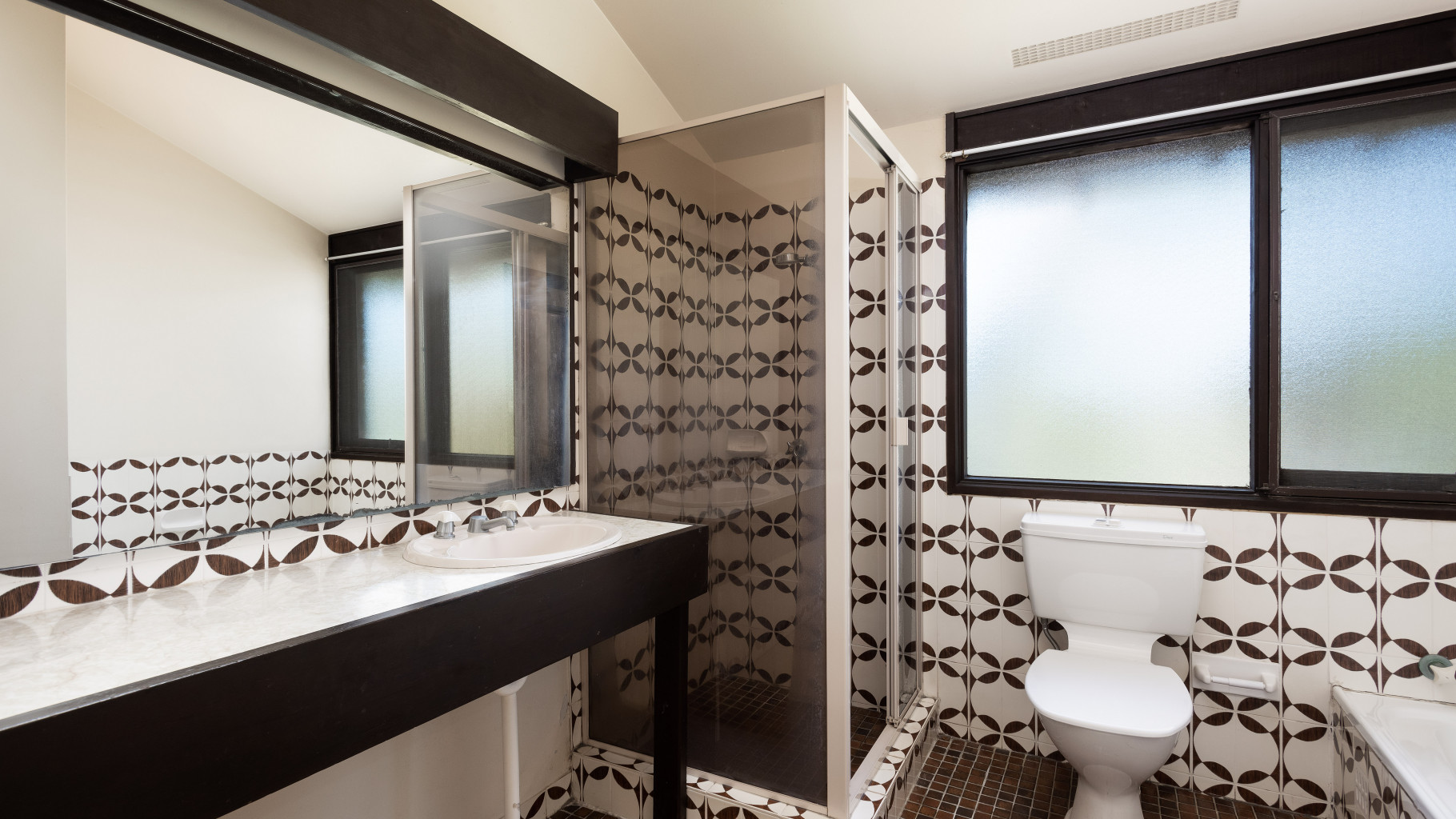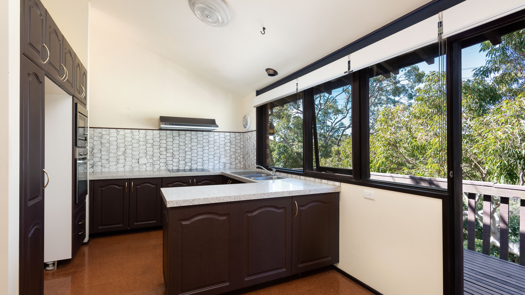 - Well-kept kitchen with electric cooktop, ample cupboard space and a stunning leafy outlook, dining with floorboards and separate meals area flowing to the back balcony