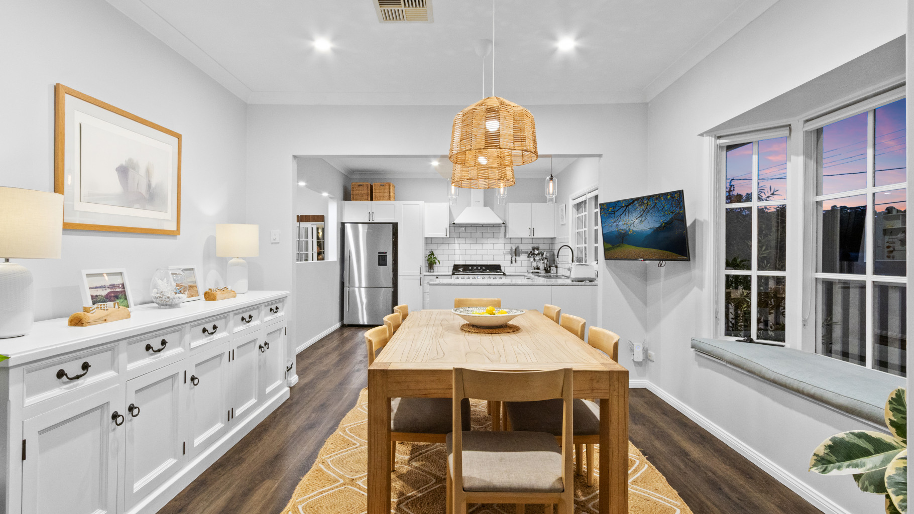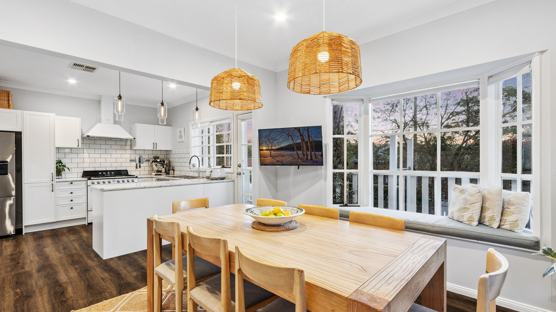 The split level design offers functional living and dining areas as well as a north-facing sunroom. These spaces are complemented by a wraparound deck ideal for entertaining or relaxing in the sunshine.