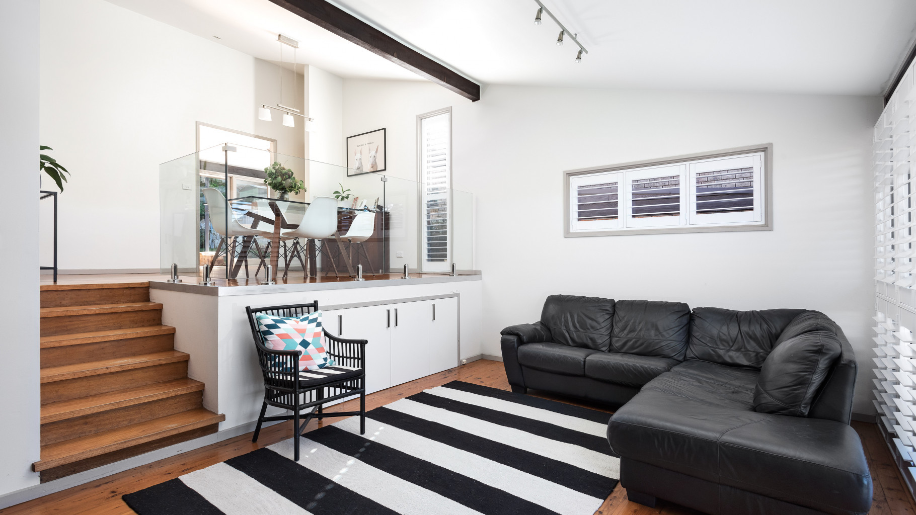 - Sunken lounge room, bathed in natural light, features plantation shutters, timber floorboards and peaceful outlook