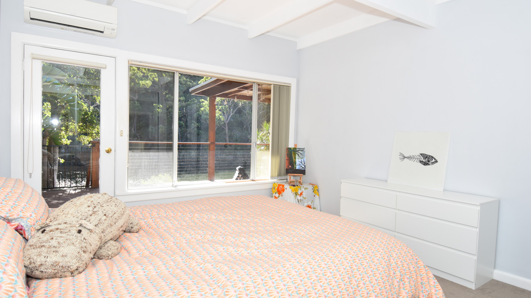 - Three light filled bedrooms, 2 with water and bush views and built in wardrobes. Air conditioned main bedroom opens out to deck