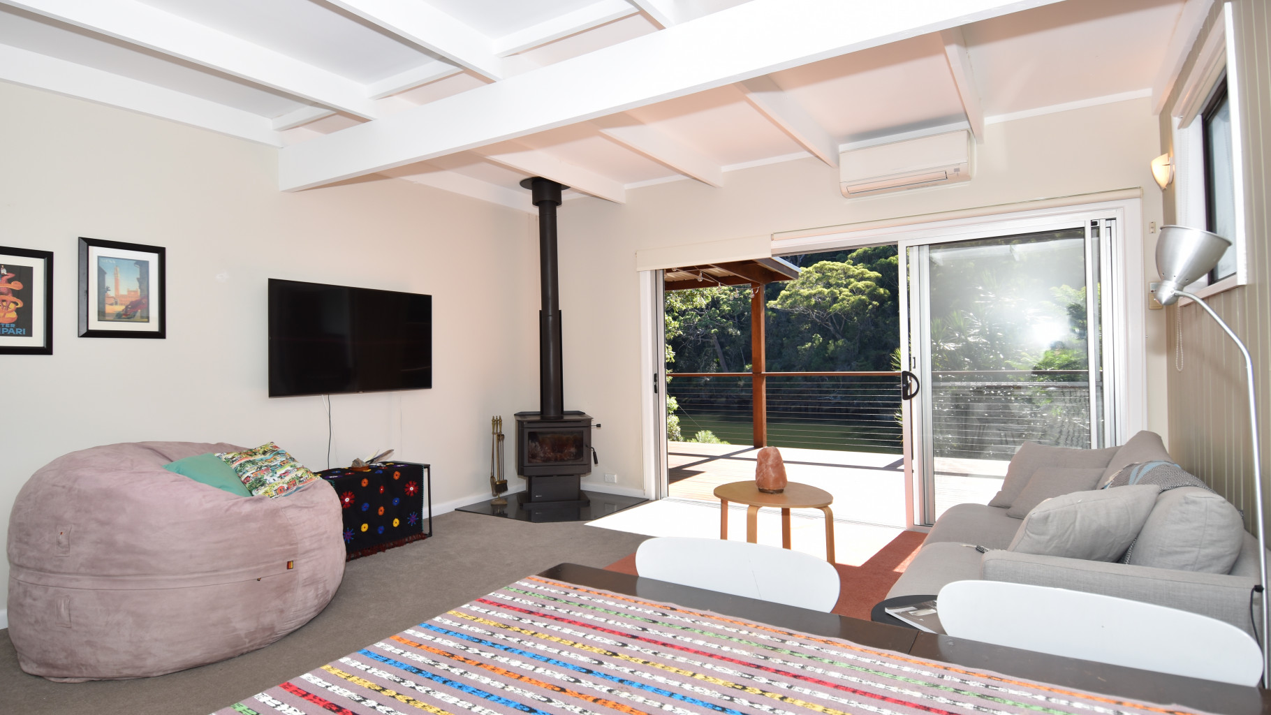 - Open plan living and dining room with fireplace and air conditioning is bathed in natural light, flows to entertaining deck and boasts a peaceful outlook across the river to the bushland