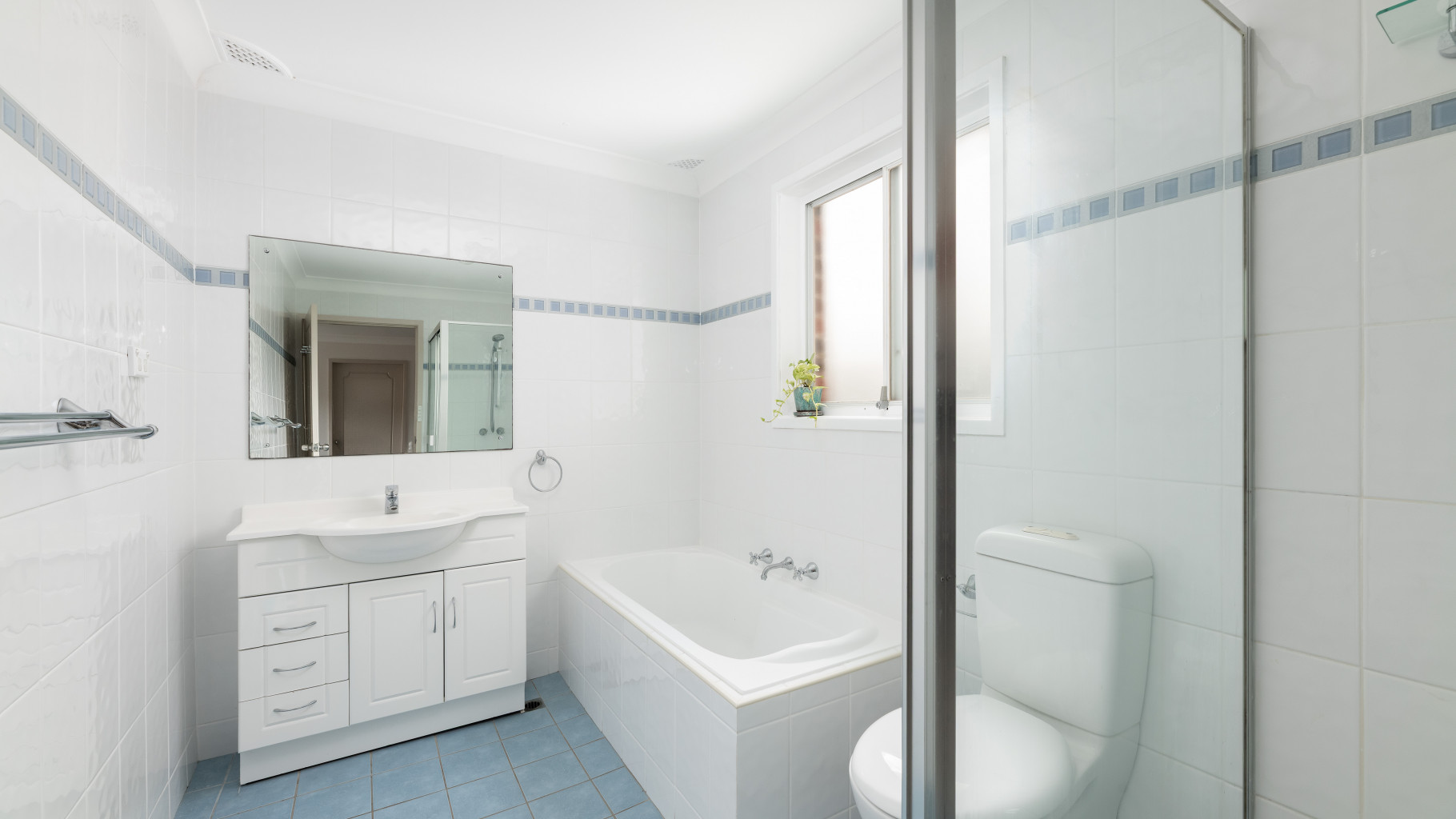 - Neat and tidy family bathroom features floor to ceiling tiles and a separate bath and shower.