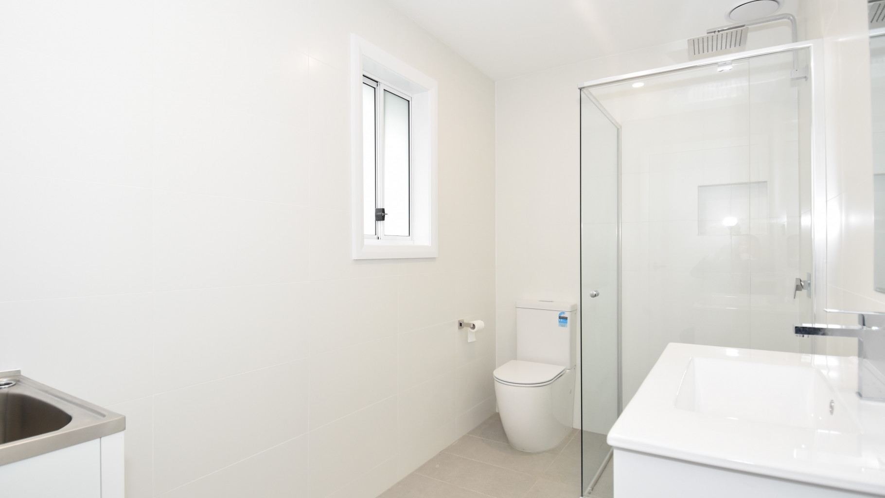 - Bathroom with floor to ceiling tiles, shower and laundry facilities