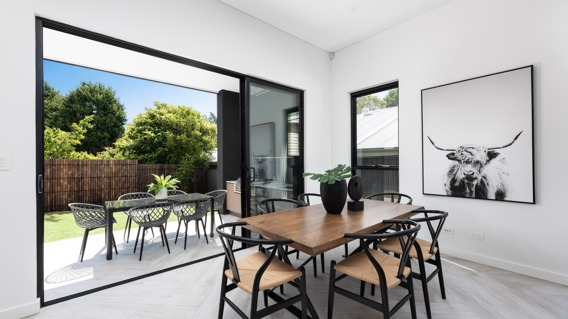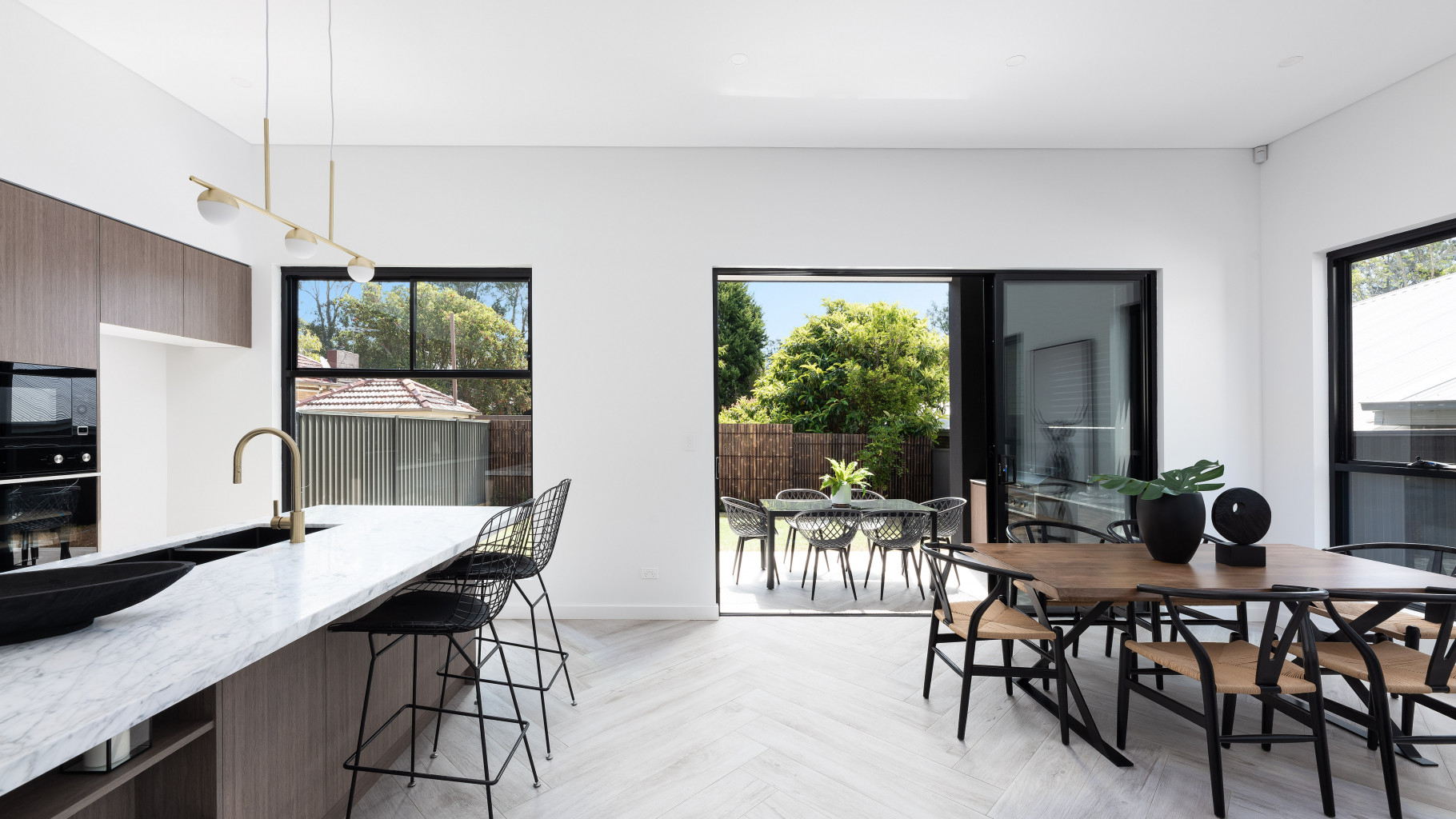 - A vast open plan living/dining area is the perfect space to relax or entertain with exquisite herringbone timber flooring, flows out to the sunbathed level backyard and covered alfresco BBQ area.