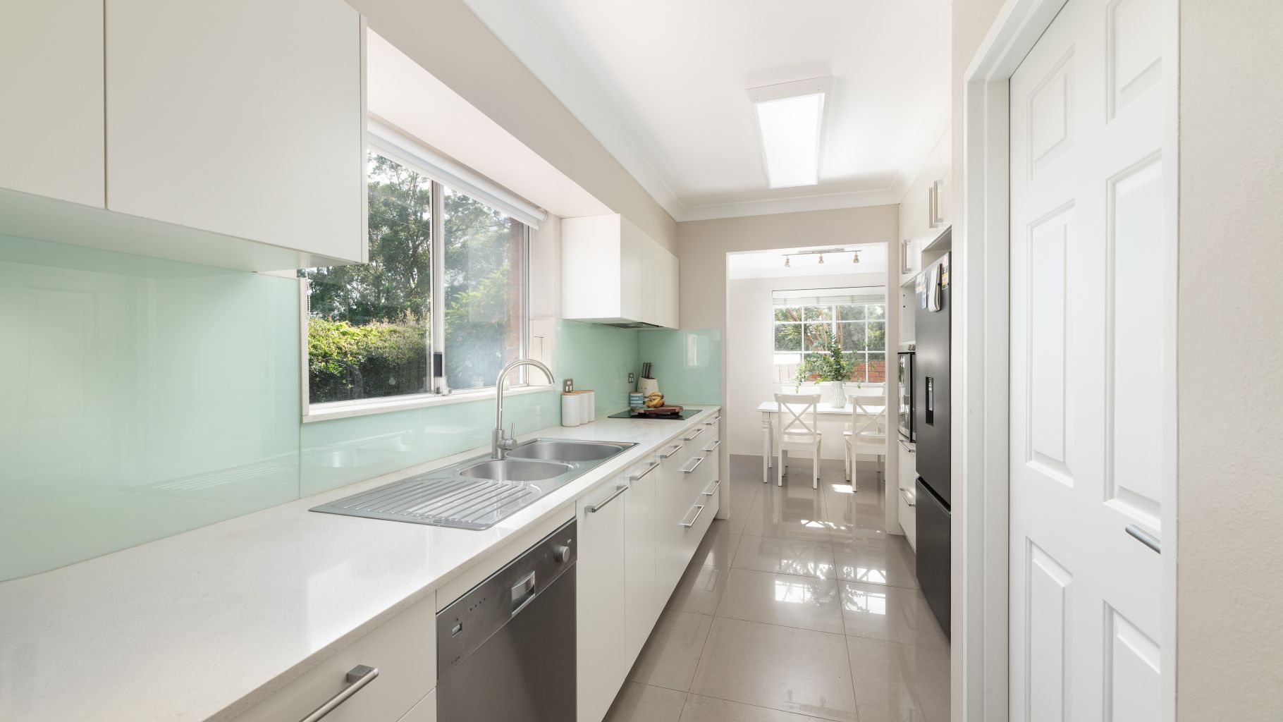 - Light filled and modern galley style kitchen features stone benchtops, quality appliances including dishwasher and ample storage.