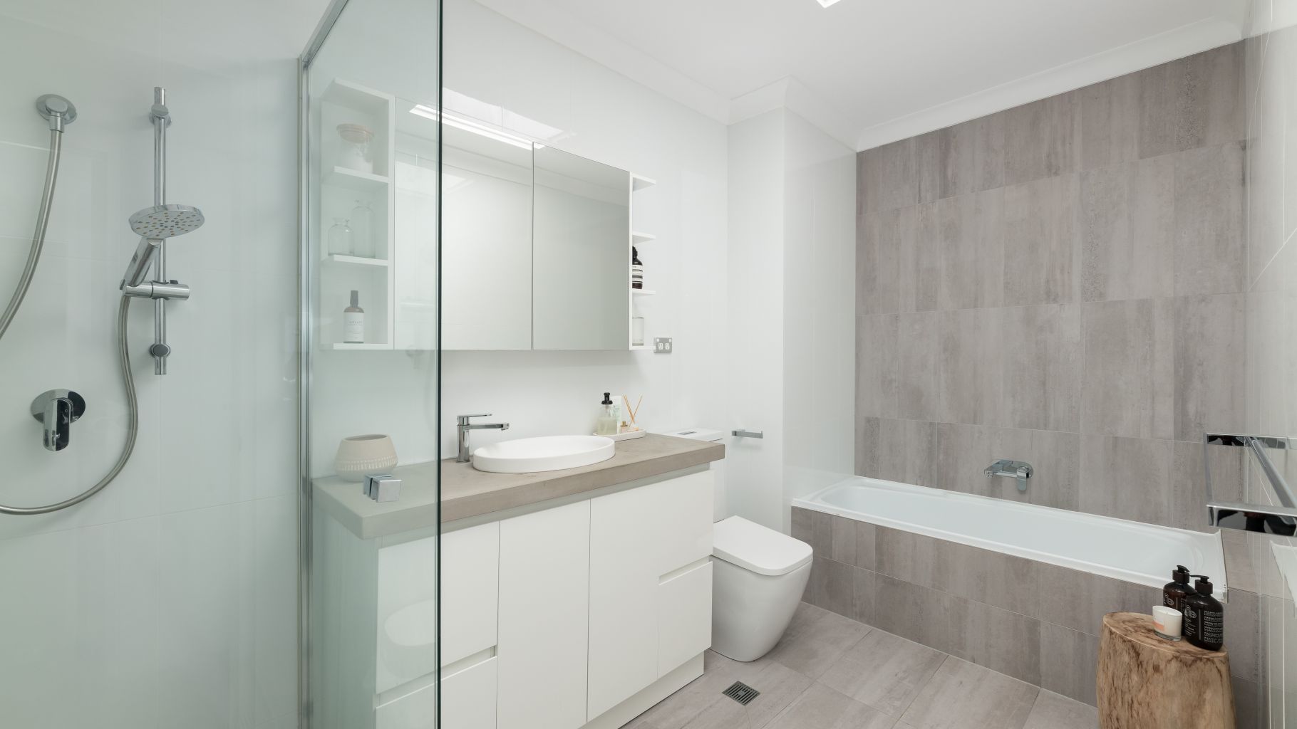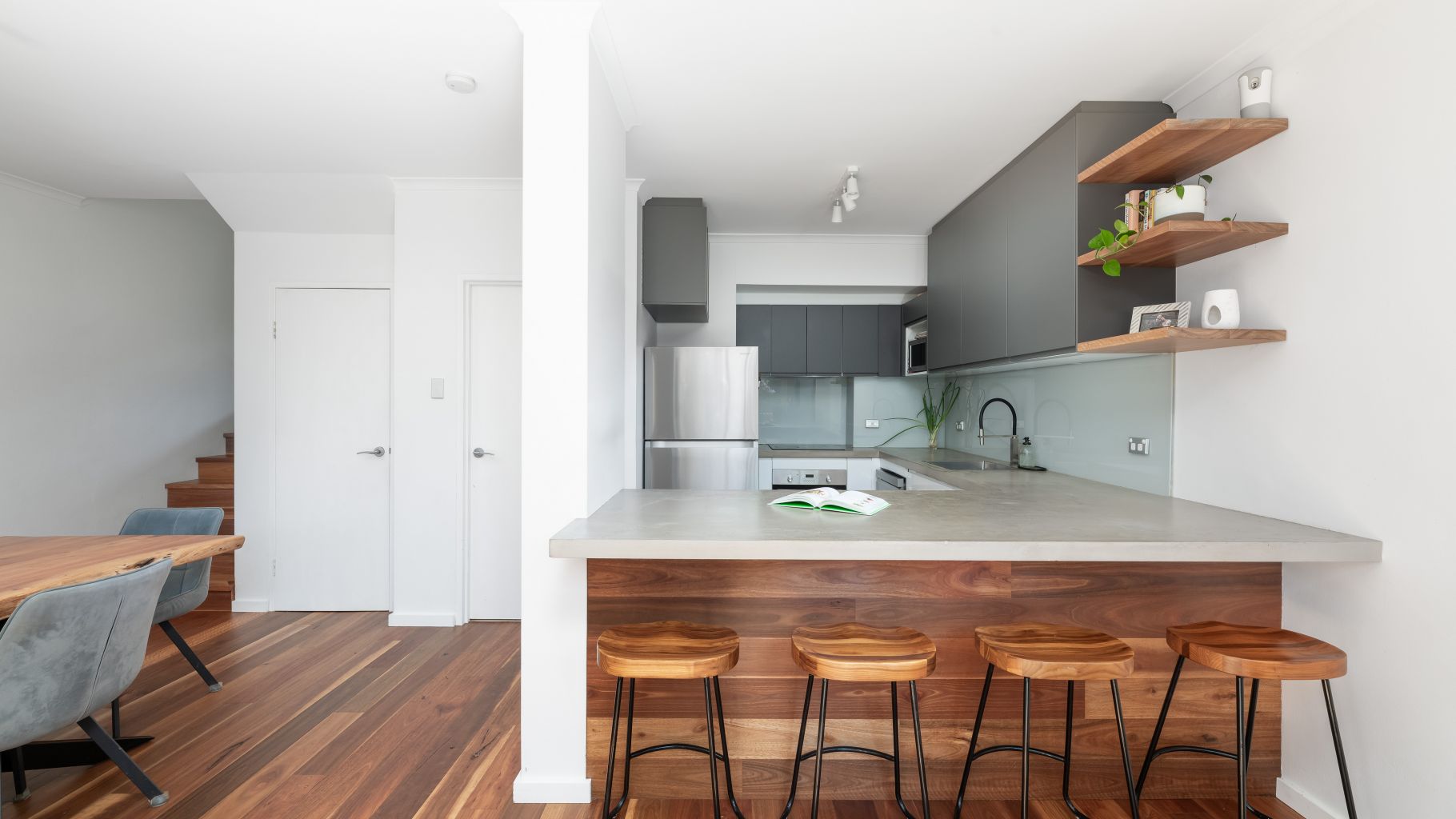 - Sleek and stylish kitchen features modern concrete benchtop, glass splash back, quality electric appliances and dishwasher, along with breakfast bar seating and ample cupboard and bench space.