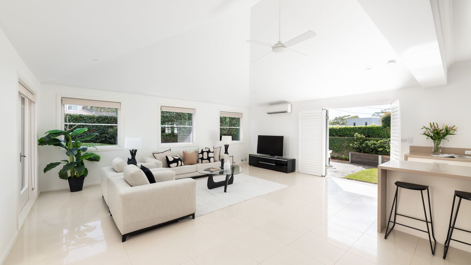 - Open plan living and dining spaces showcase high raked ceilings, sleek downlights, gas bayonets, split-system air conditioning and abundant natural light streaming through large windows, seamlessly connecting indoors and outdoors.