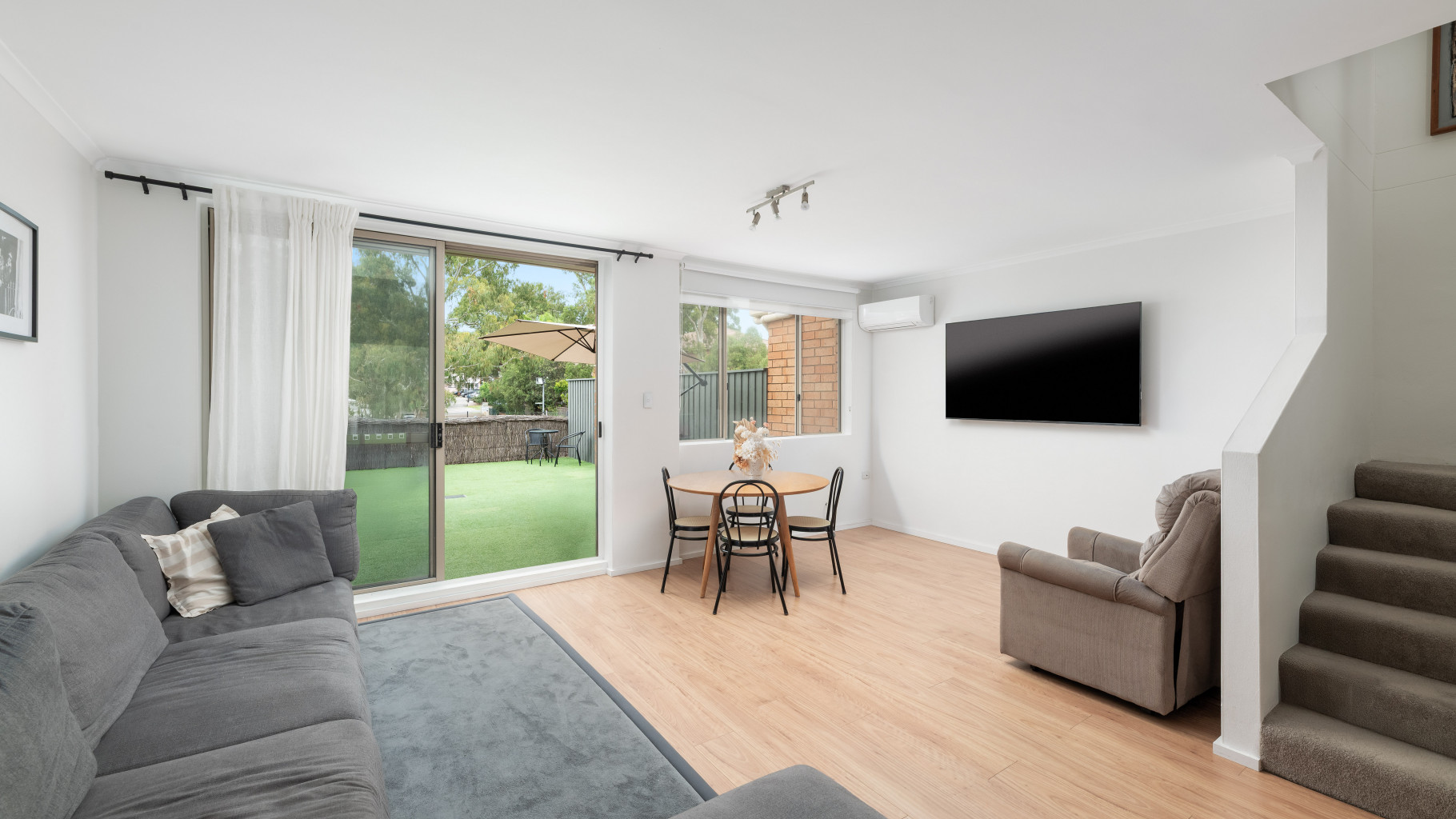 - Open plan living and dining area is adorned with floorboards and split system AC, seamlessly flows to an expansive, private terrace, perfect for indoor-outdoor living.