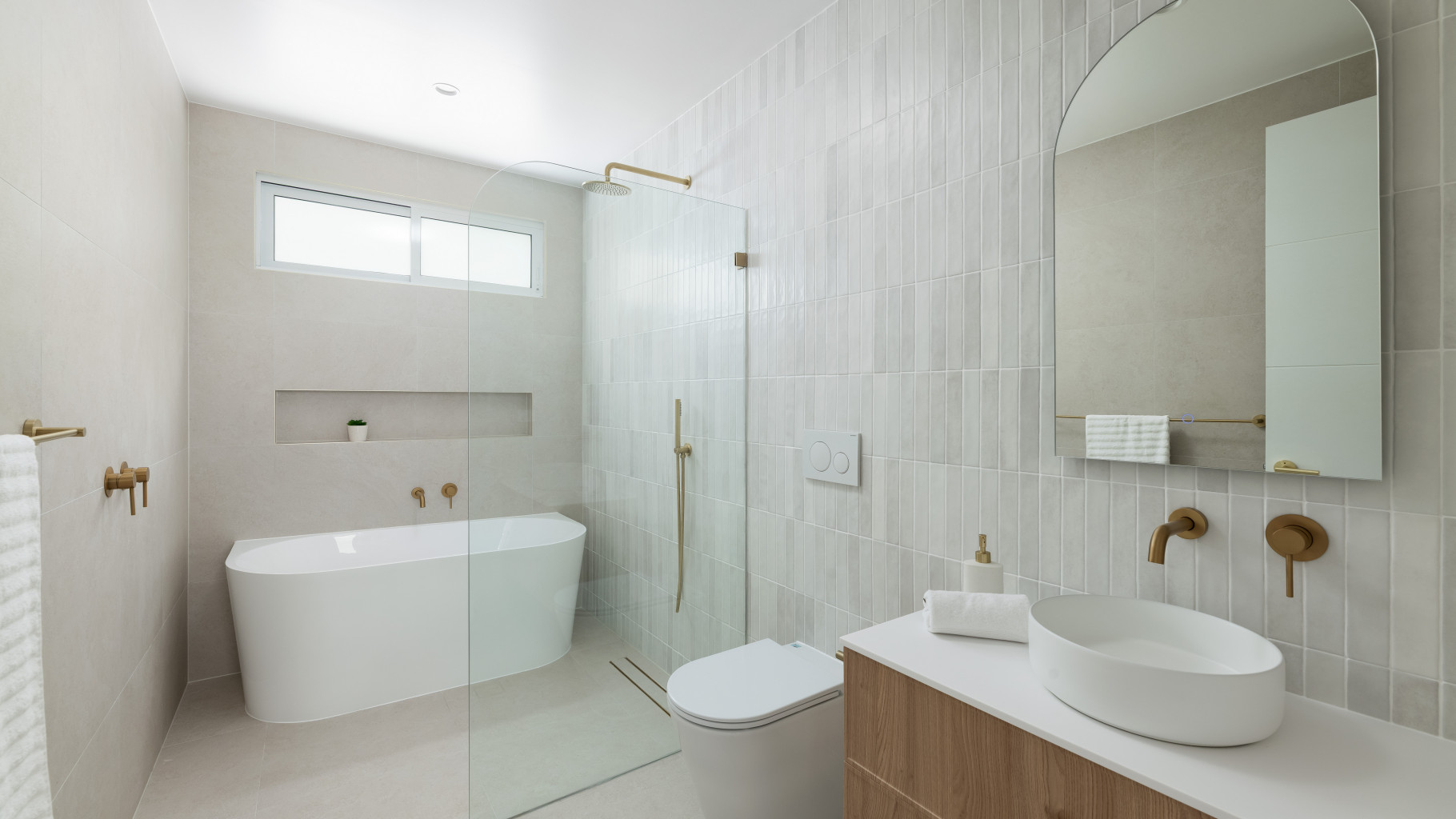 • Sleek family bathroom with feature tiles and wet area with bathtub, additional bathroom on entry level for added convenience