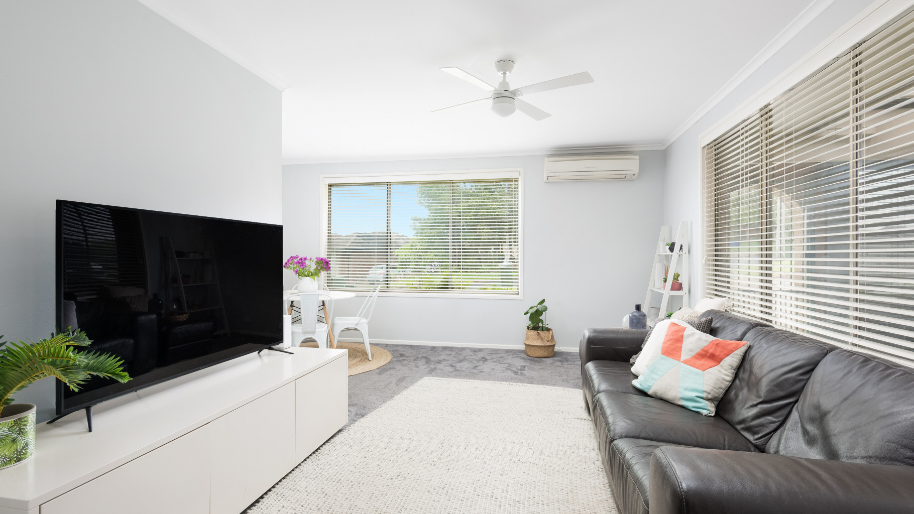 - Inviting living and dining room showcasing split system air conditioning and ceiling fan