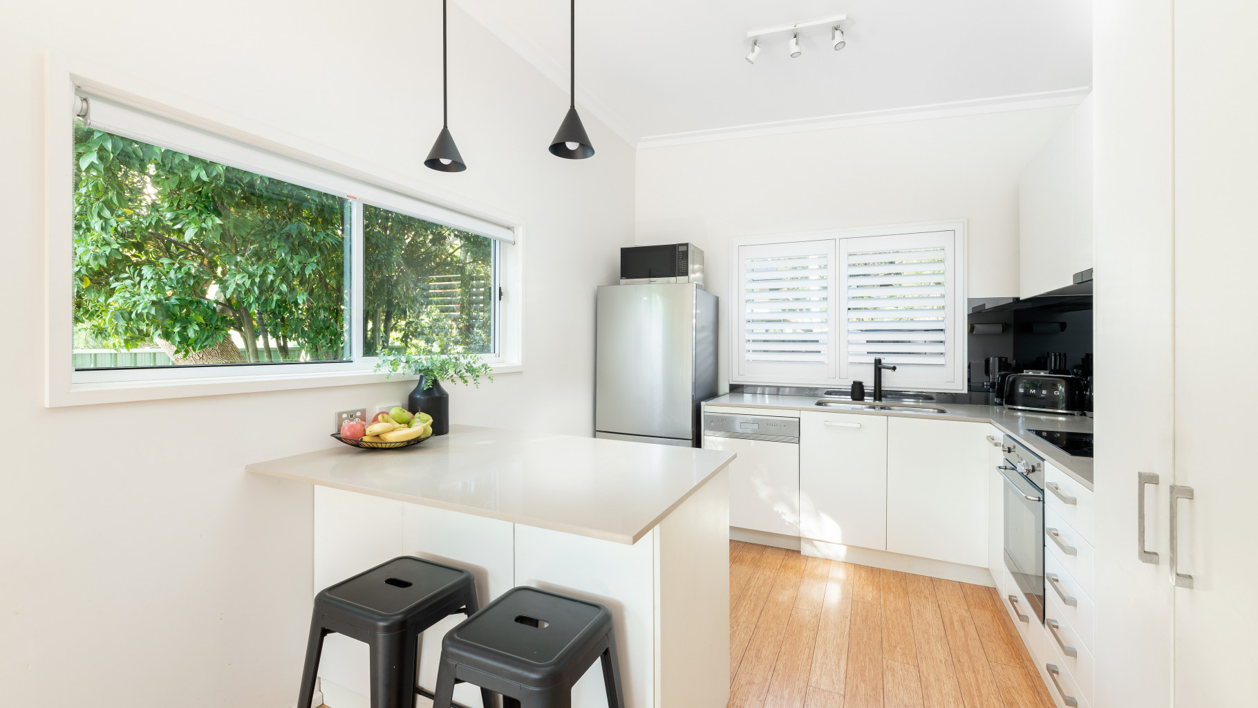 - Smeg appliances including an induction cooktop and integrated dishwasher.