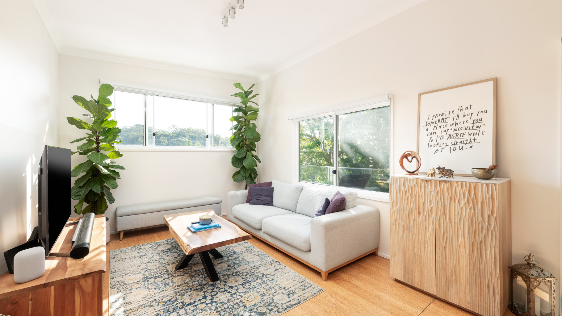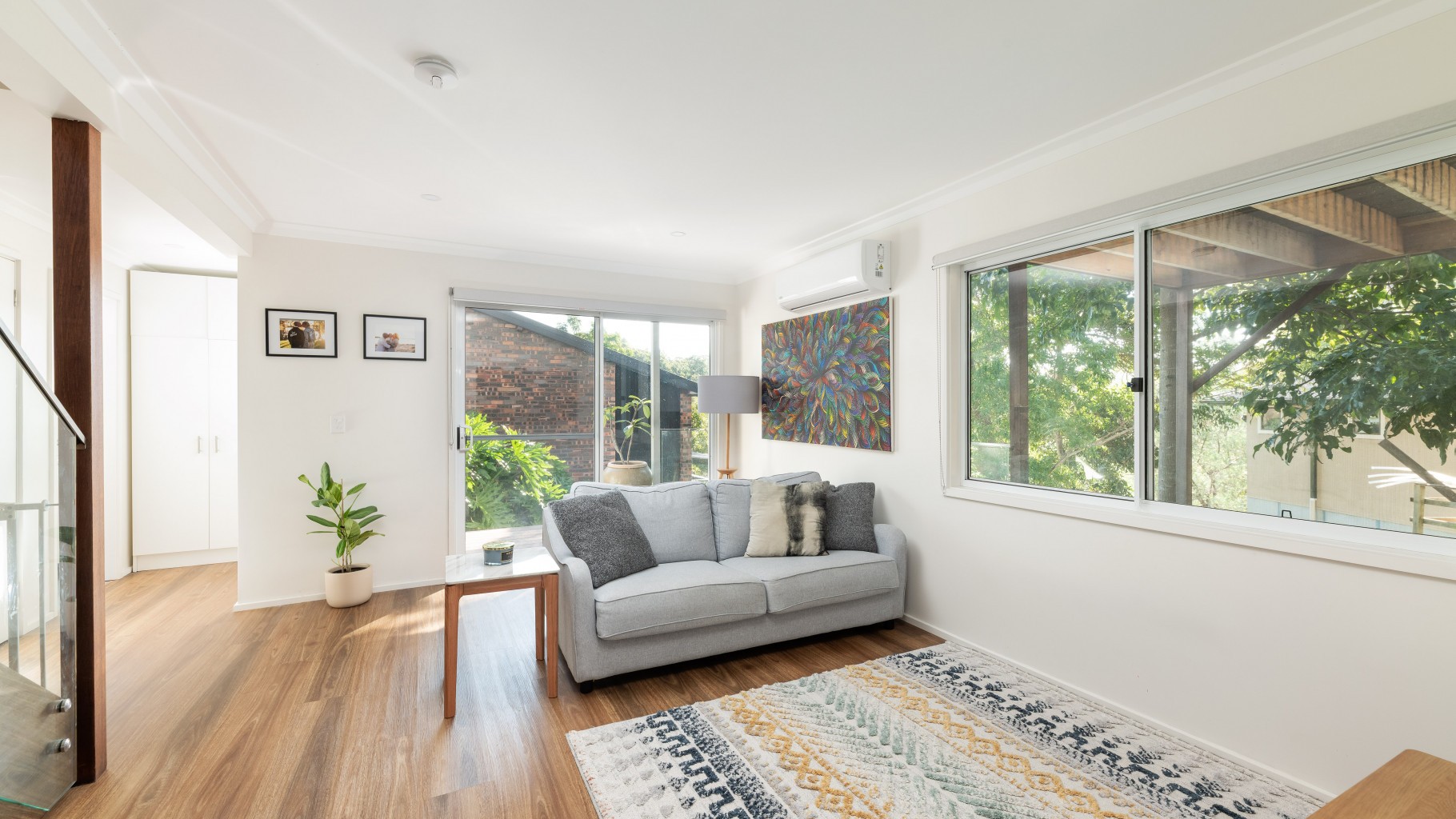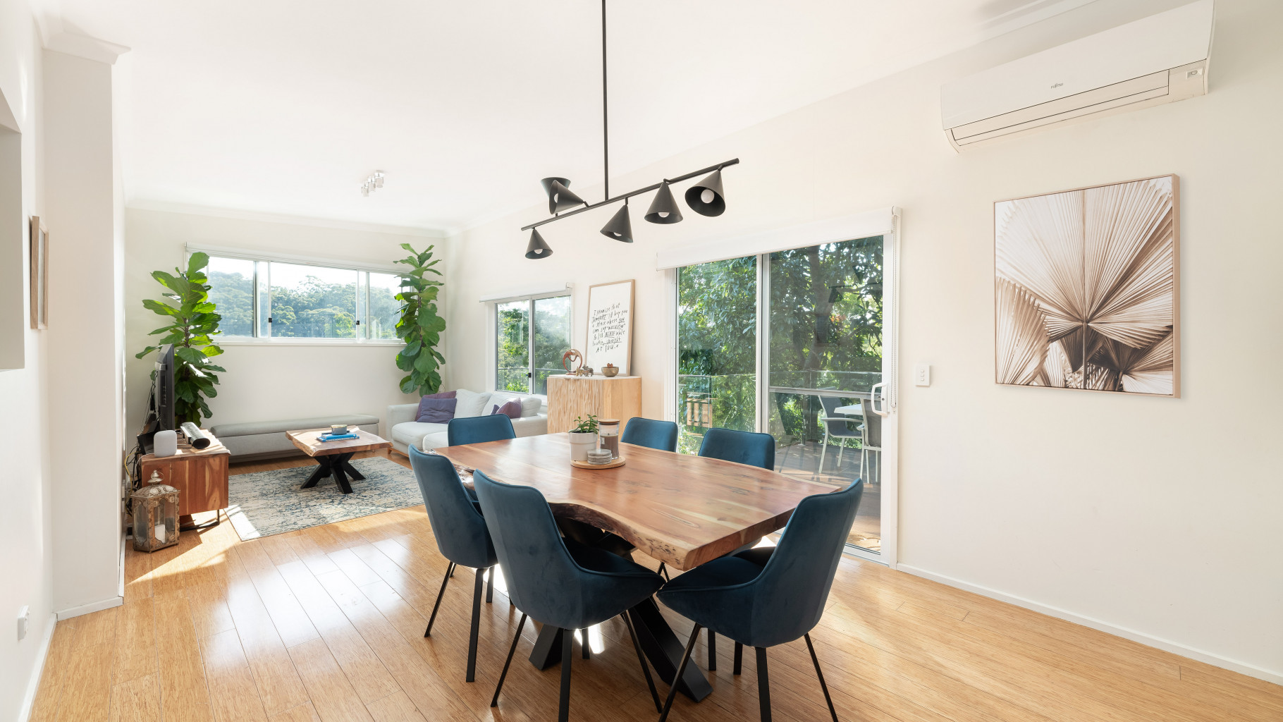 - Light filled open plan living, kitchen and dining area enhanced by high ceilings, split system air conditioning and timber floorboards, flowing seamlessly to the entertaining deck.