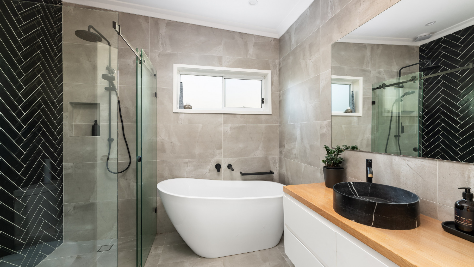 - Elegant family bathroom showcasing floor to ceiling tiles, a deep freestanding bathtub, floating vanity with designer basin and a frameless glass walk-in shower with dual showerheads.