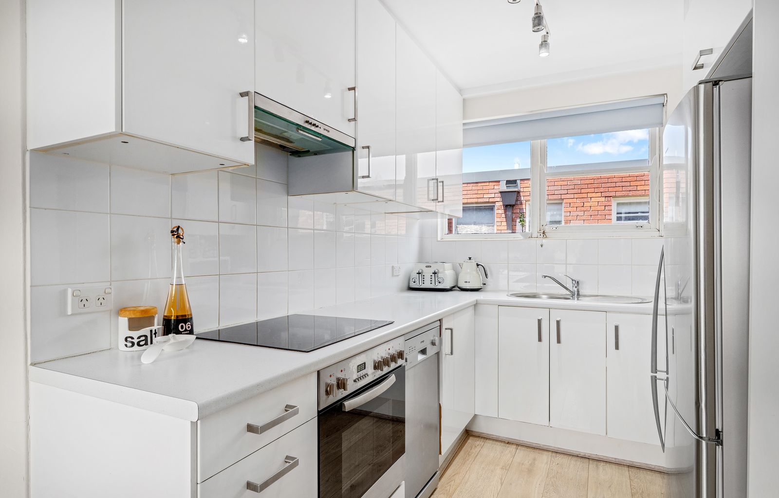 -Renovated, bright kitchen with electric cooktop and tiled splashback