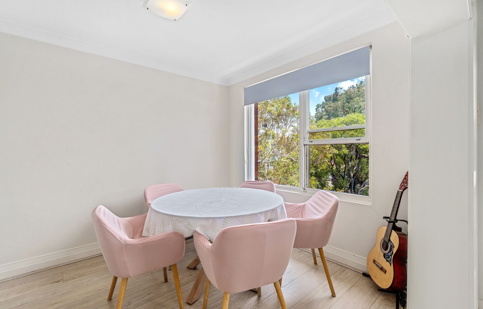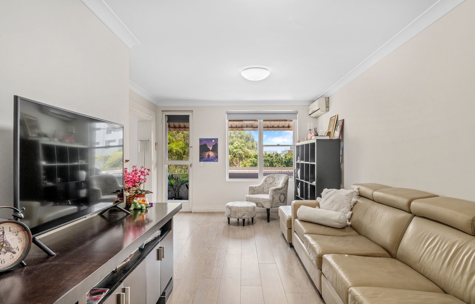 -Spacious combined living and dining area with floorboards, split-system air conditioning and balcony access