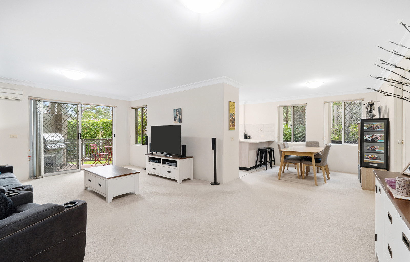 - Large open-plan living and dining area with split system air-conditioning, connecting smoothly to the outdoor balcony with convenient common courtyard access