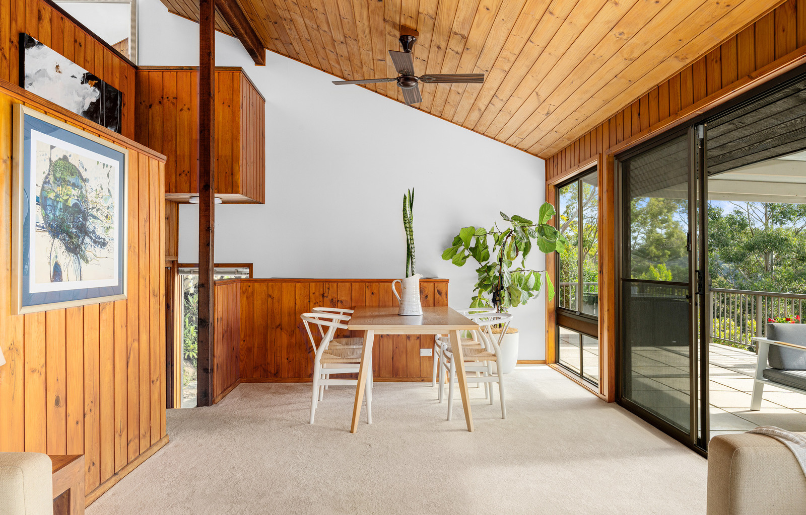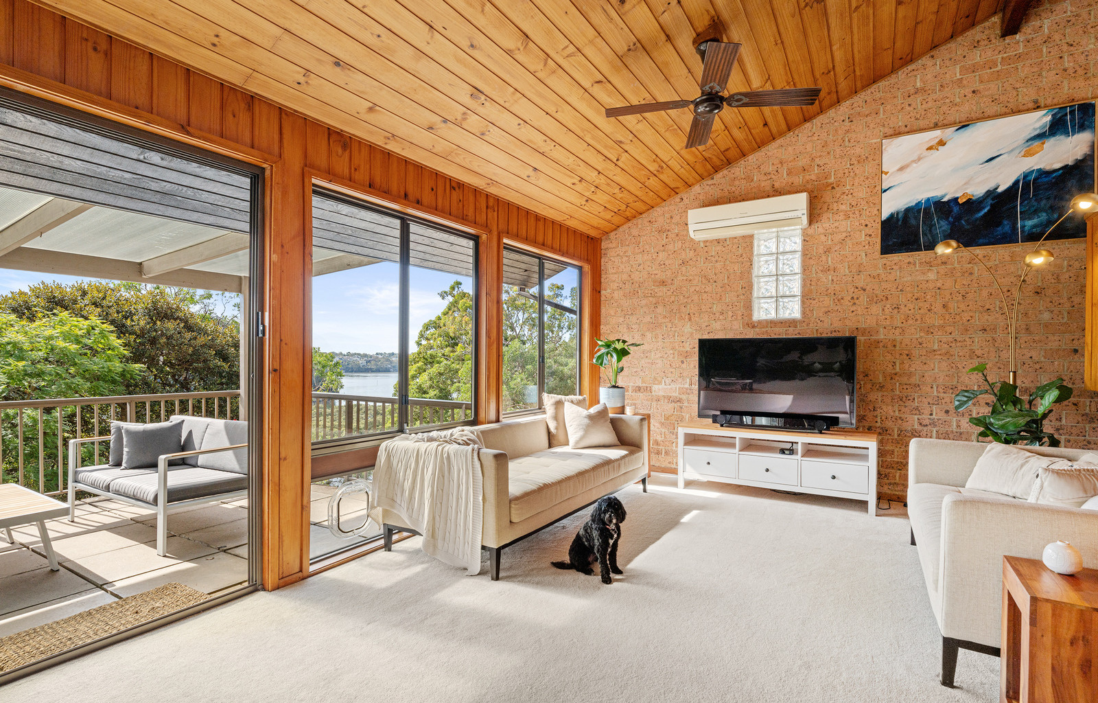- Inviting living and dining area featuring pitched wooden paneled ceilings, two ceiling fans, and split system air conditioning, leading effortlessly to a spacious balcony capturing serene water views.