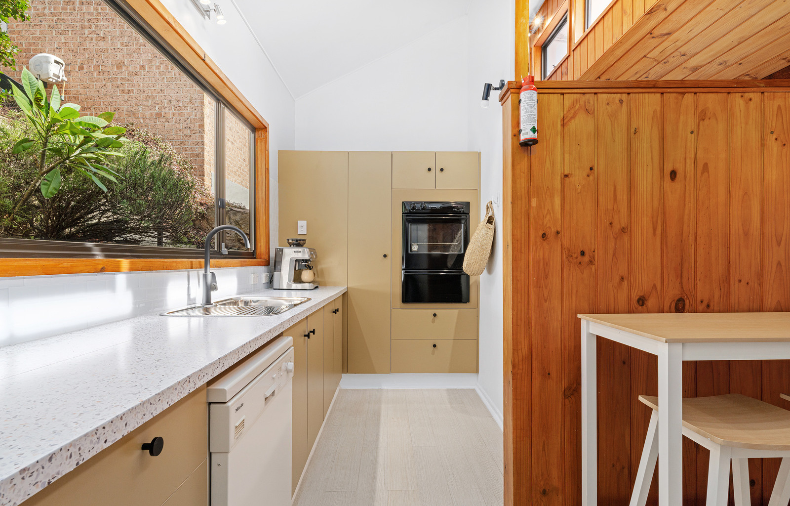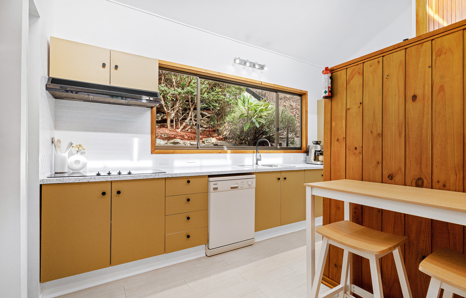 - Recently renovated, this character-rich kitchen is equipped with an electric cooktop, dishwasher, pantry, and ceiling fan, complemented by skylights that flood with natural light.