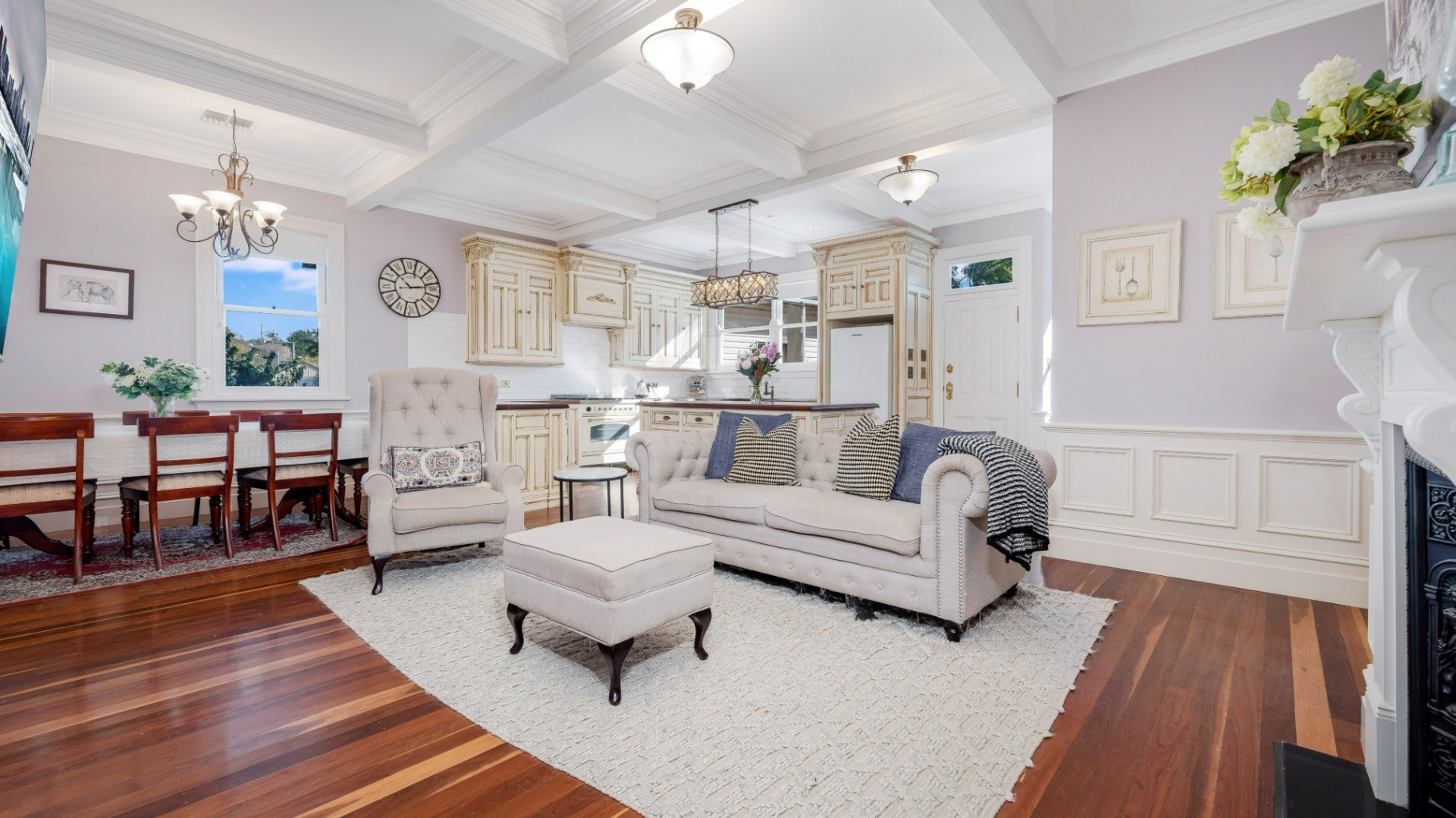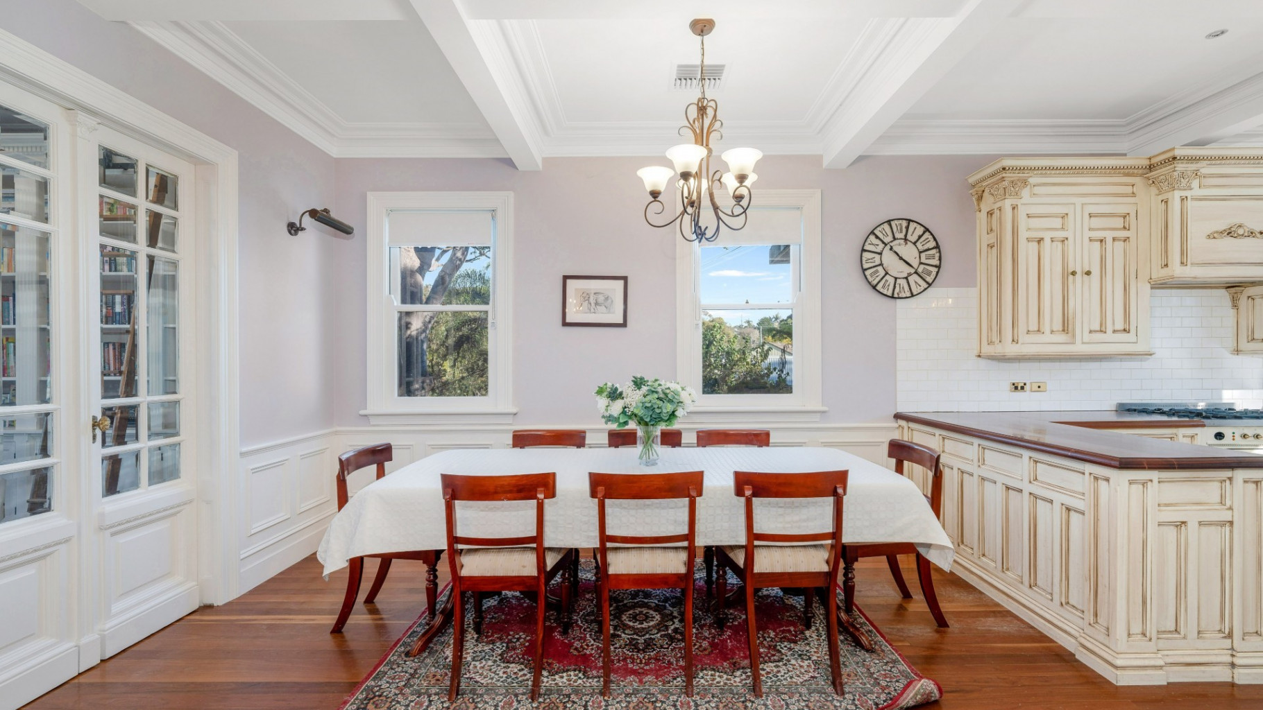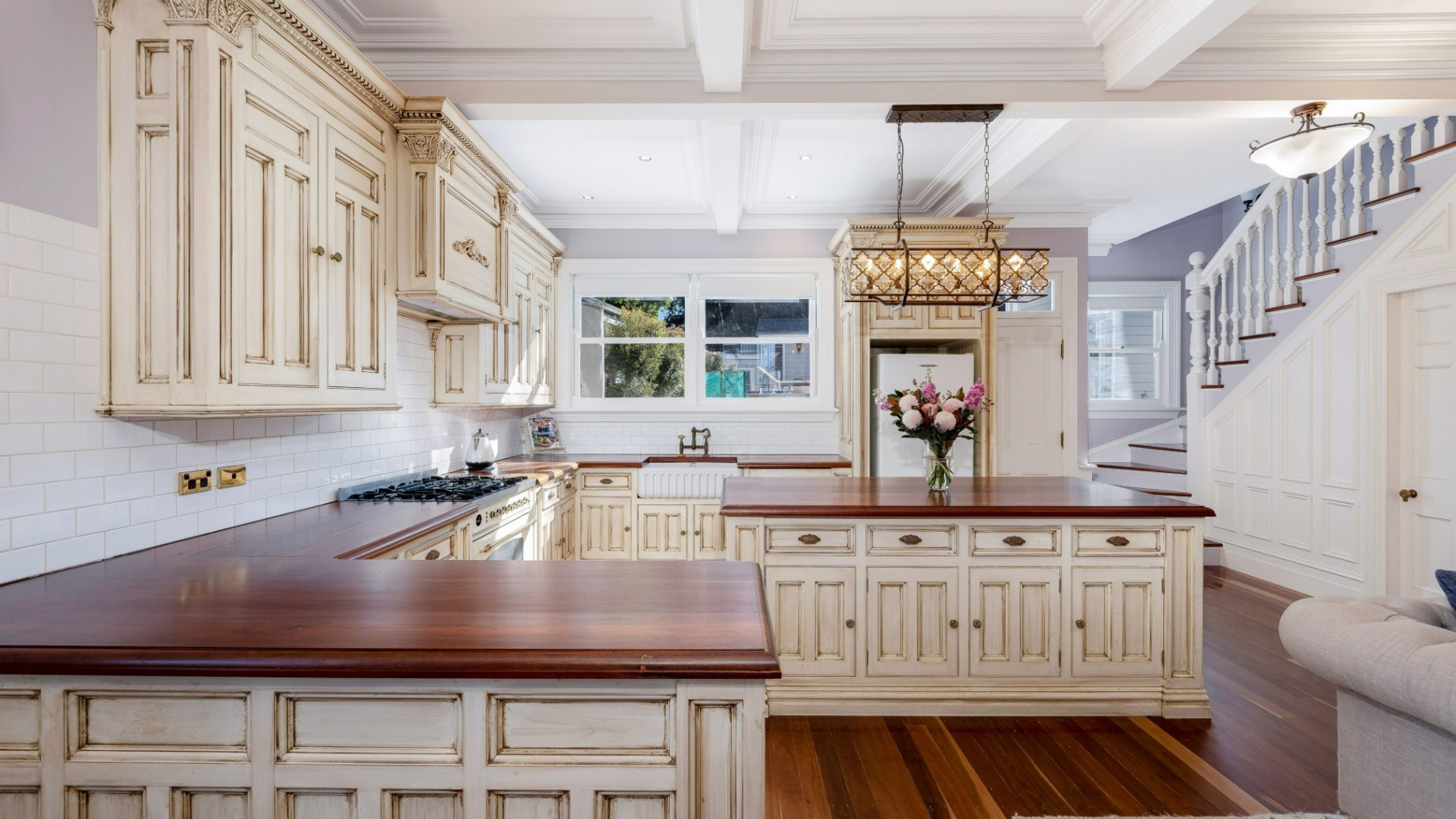 - Gourmet kitchen featuring exquisite traditional cabinetry, rich timber benchtops, elegant pendant lighting, quality appliances, and gas cooktop. Bathed in natural light and offering outstanding workspace, this kitchen is the true heart of the home, perfect for entertainers.
