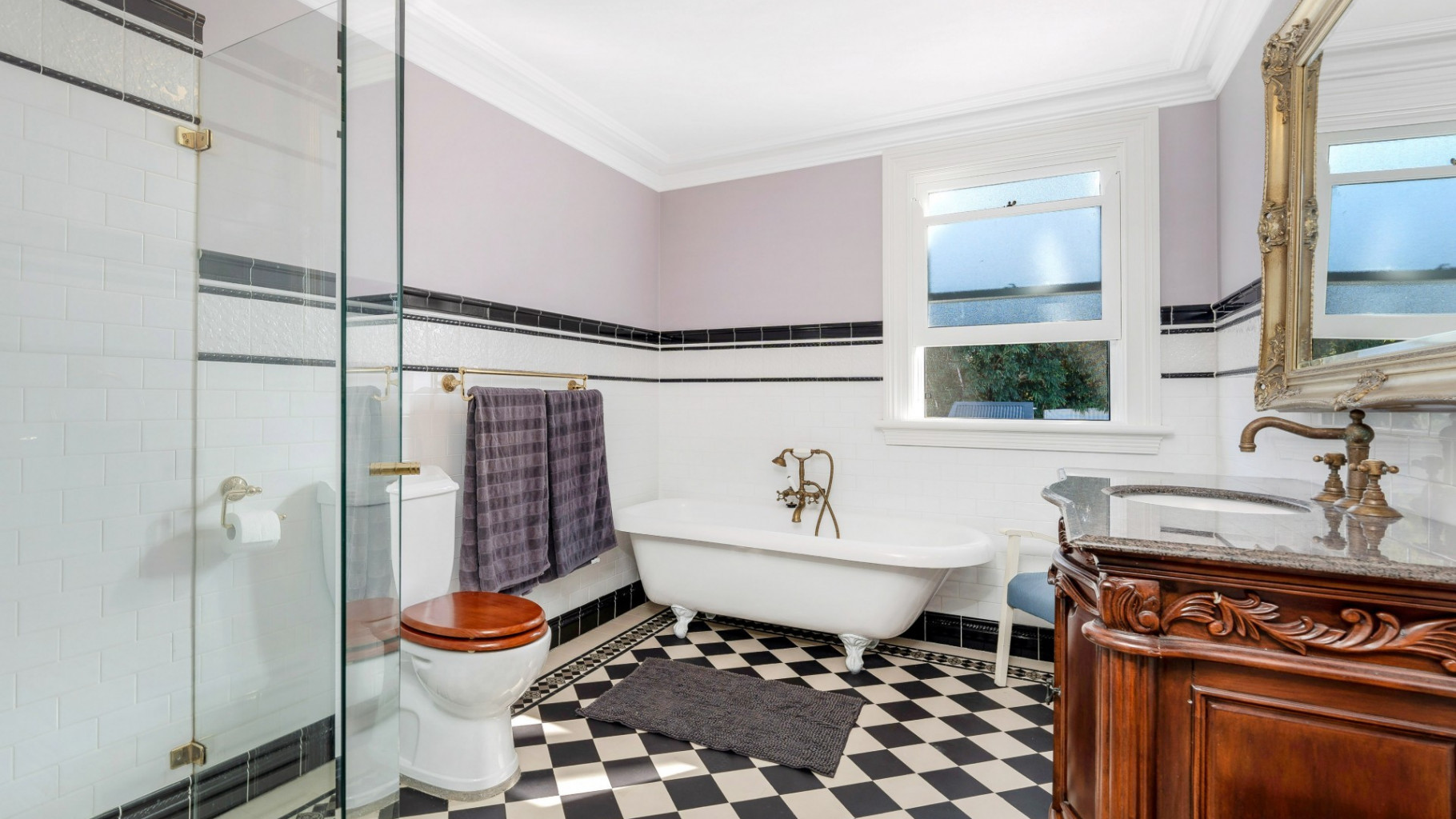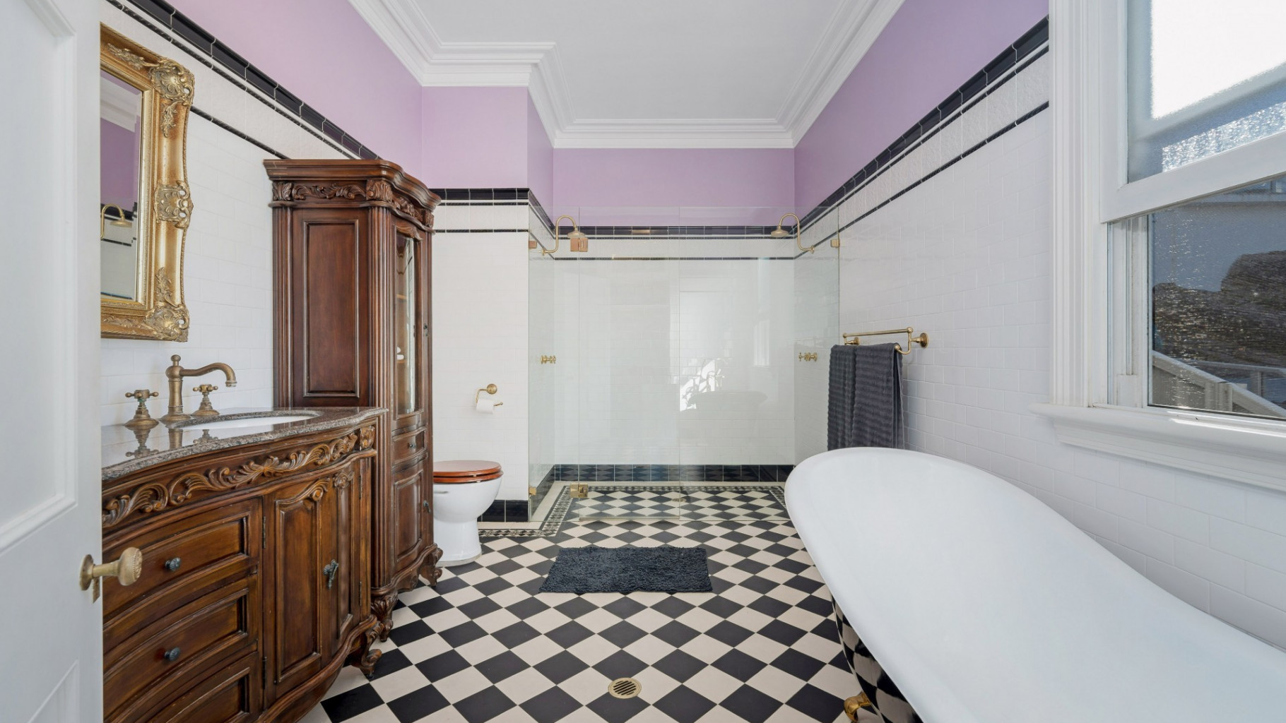 - Elegant family bathroom showcasing an ornate soaker tub, separate shower, and refined brass fixtures and fittings.