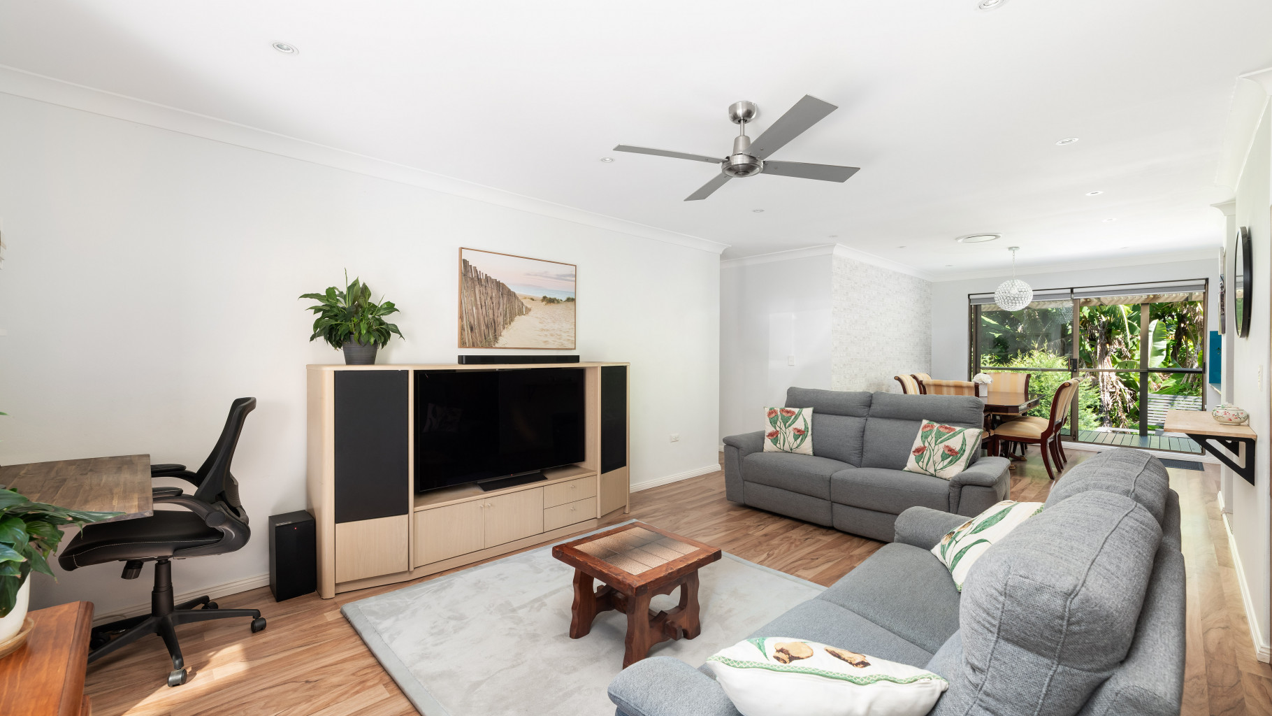 - Three well-proportioned bedrooms, all with carpet, ducted air-conditioning and ceiling fans, master with mirrored built-in wardrobe