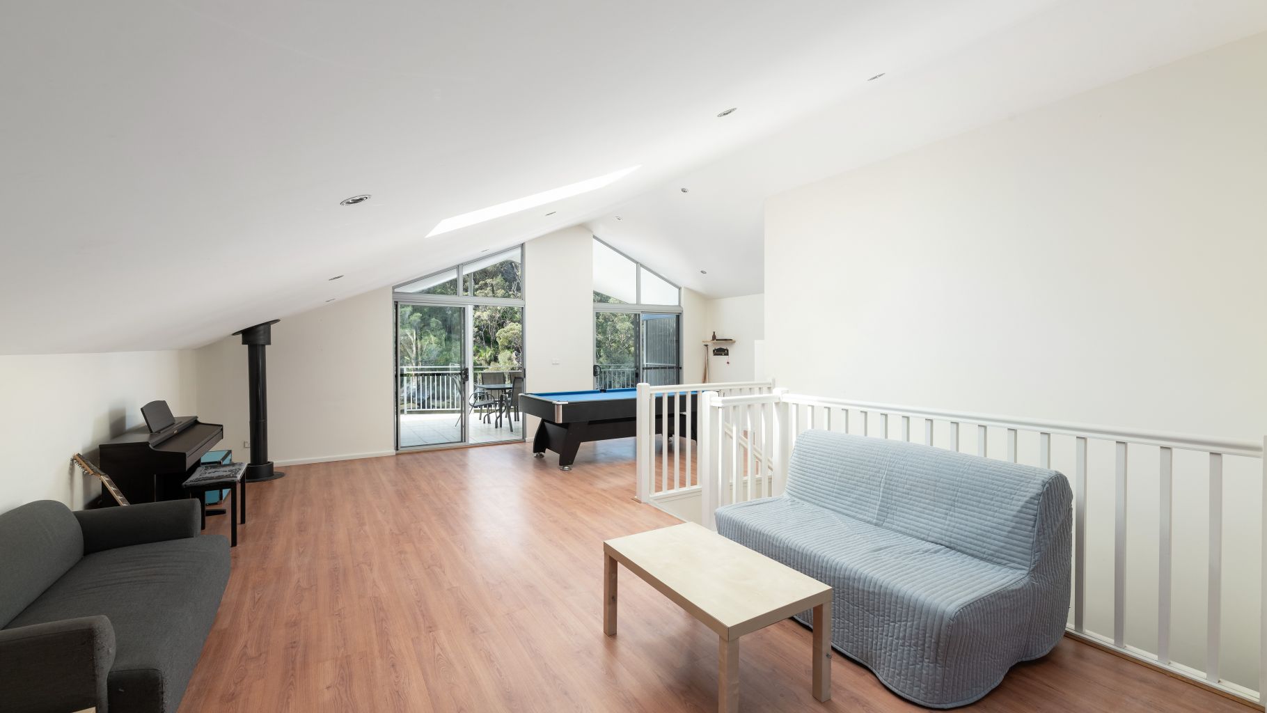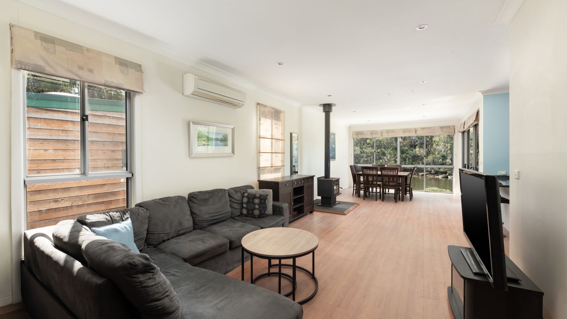 - Generous open-plan lounge and dining area with peaceful river views, a cozy wood fireplace as the central feature, air conditioning for year-round comfort, and access to an entertaining balcony overlooking the expansive grassed yard.