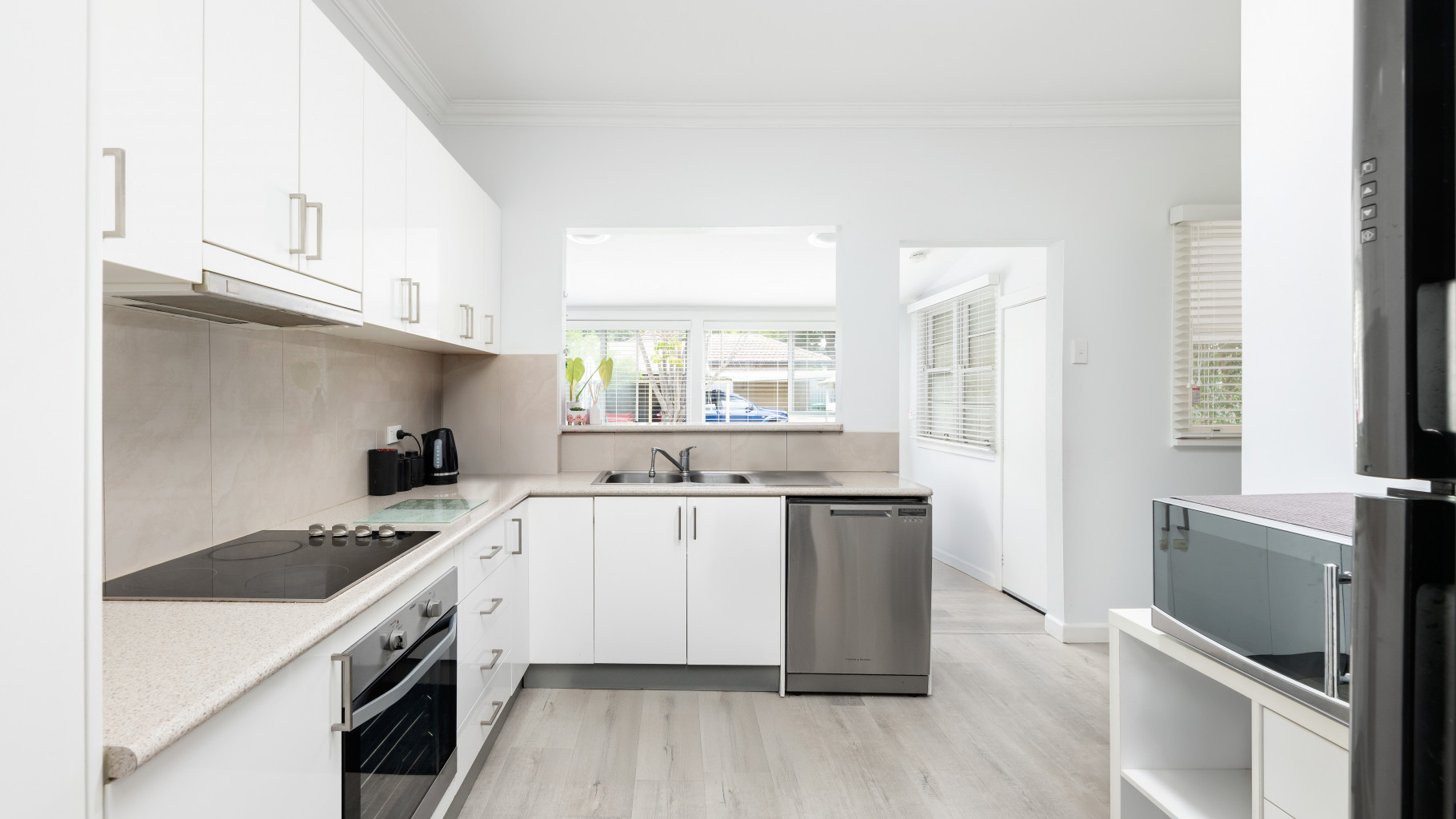 - Contemporary, centrally positioned kitchen bathed in natural light from skylight, complete with quality appliances including a dishwasher, plus generous cupboard and bench space.