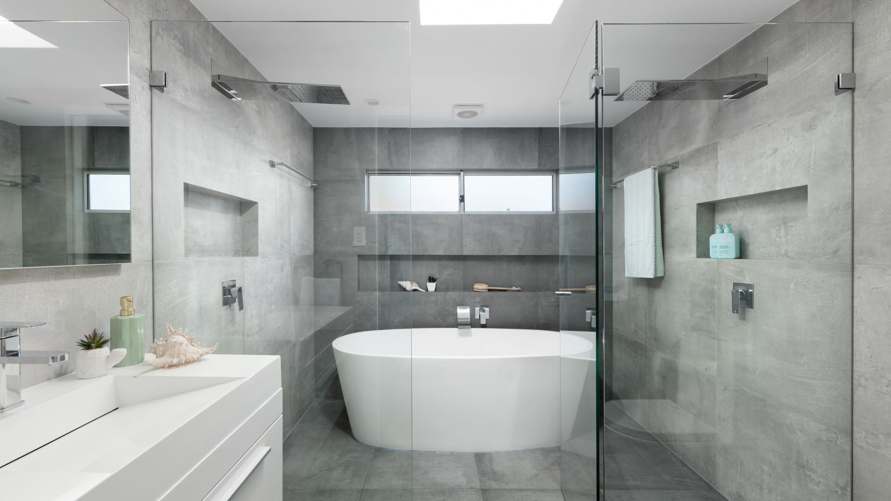 - Fully tiled, luxurious family bathroom featuring an oversized frameless glass walk-in shower with dual showerheads, a deep freestanding bath, sleek recessed shelving with LED lighting and a skylight that fills the space with natural light.