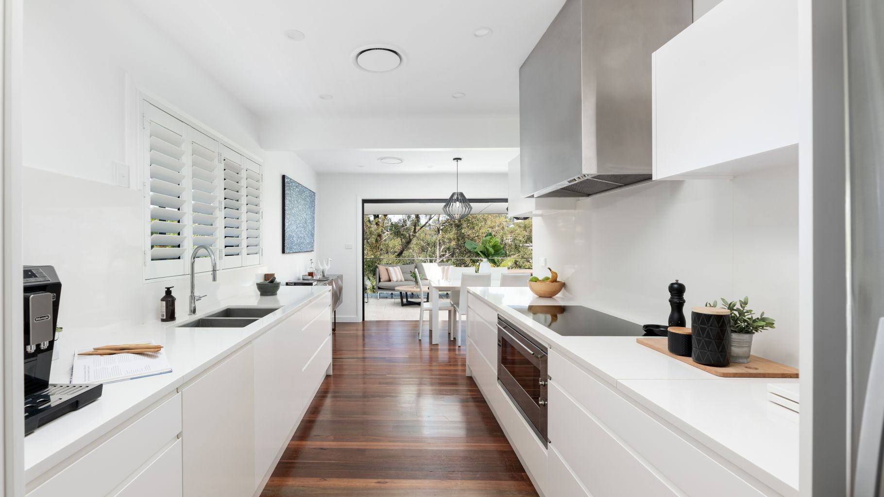 - Spacious galley-style kitchen is bathed in natural light from a skylight and appointed with premium 900mm Smeg appliances, soft-close cabinetry, an undermount sink, abundant storage, and double-width Caesarstone benchtop with matching splash back, adjacent to the dining area.