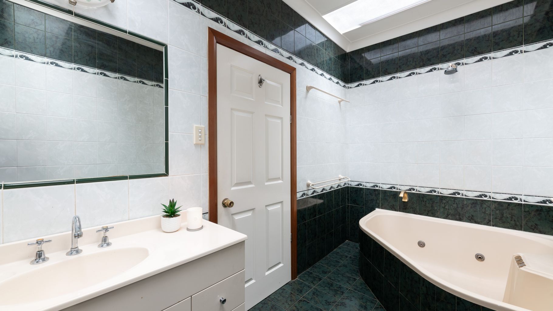- Neat family bathroom with floor to ceiling tiles and a practical combined spa bath and shower.