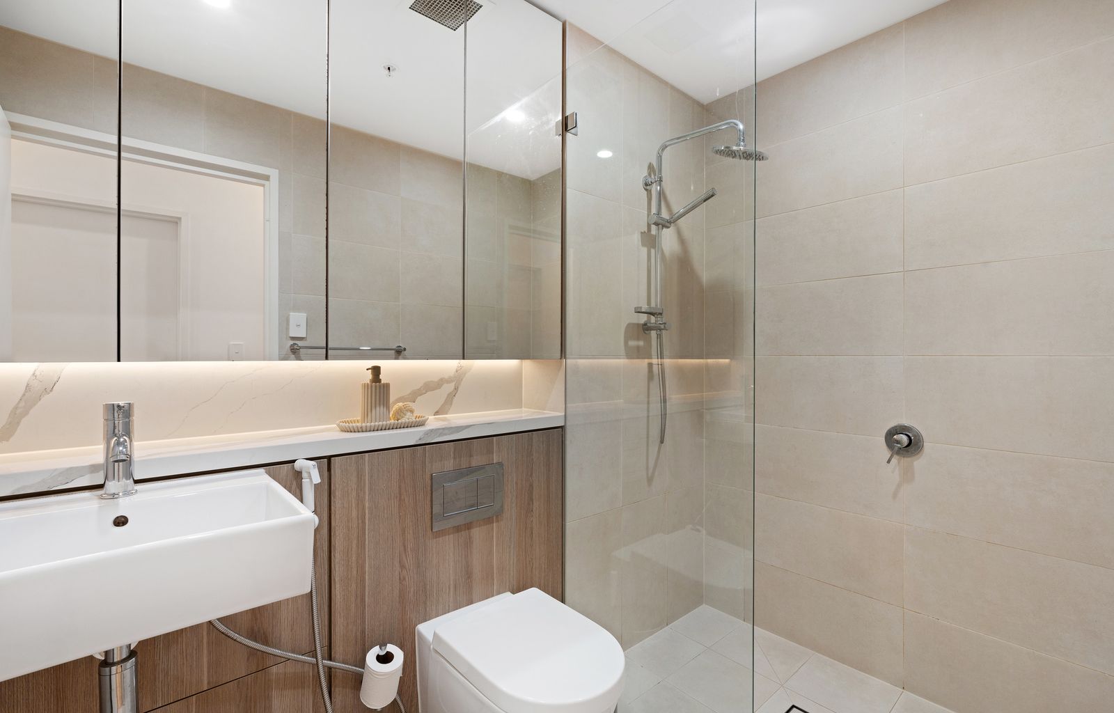 - Modern bathroom complete with mirrored cabinetry and large shower.