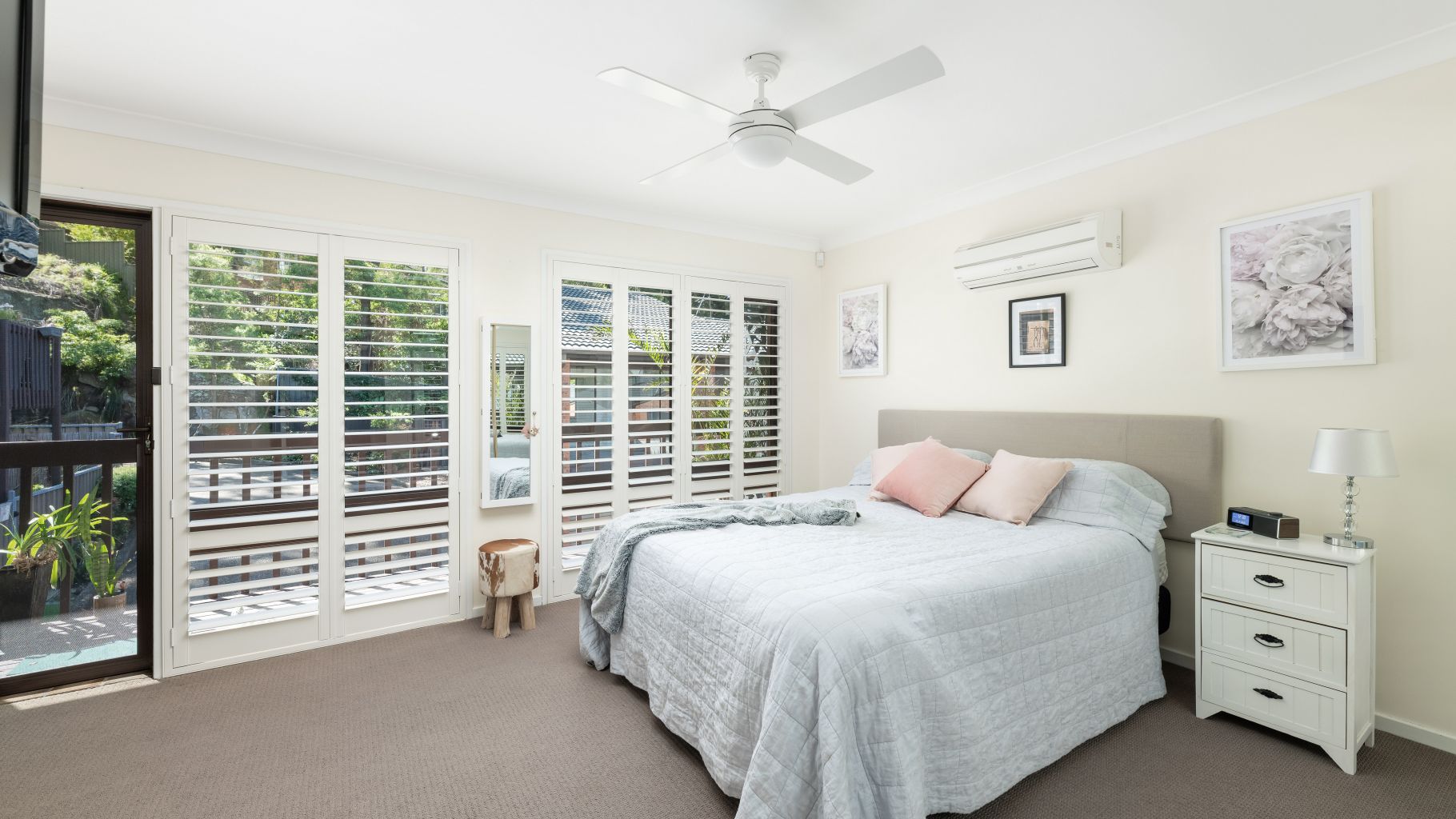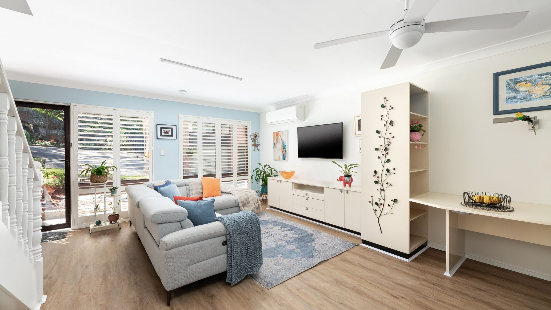 • Open plan living and dining area complemented by plantation shutters, split system air conditioning, and ceiling fan for year-round comfort