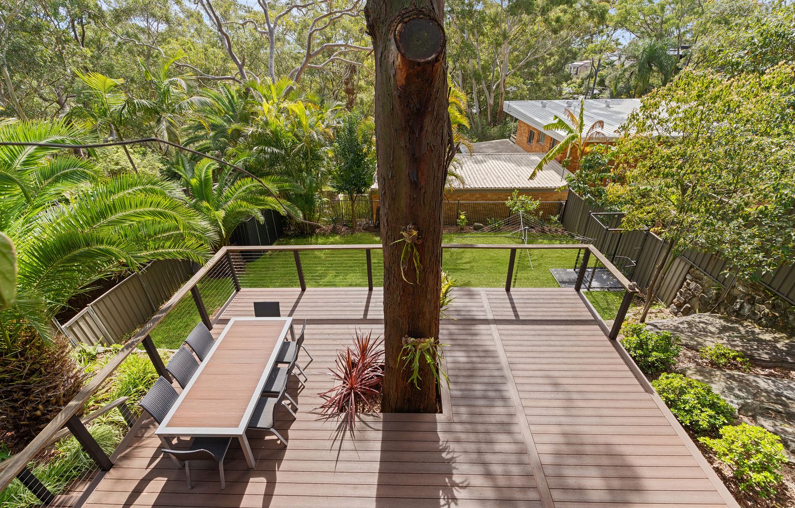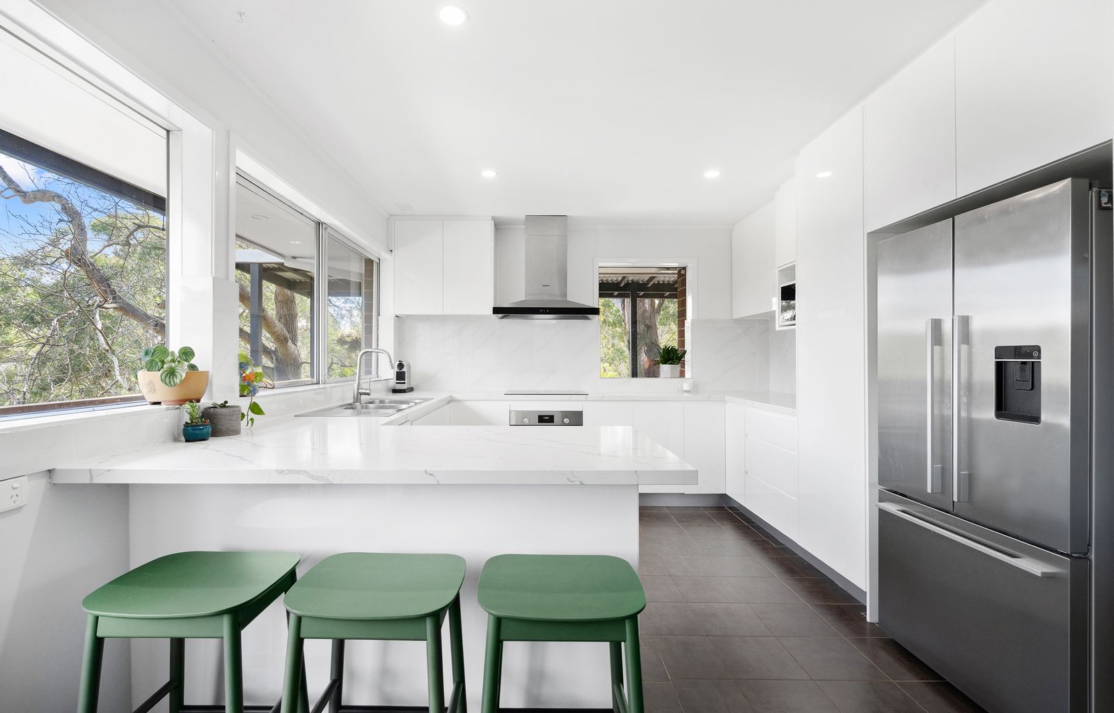 - Modern kitchen with electric cooktop, double sink, abundant bench and storage space, flowing into the bright dining area with serene nature views
