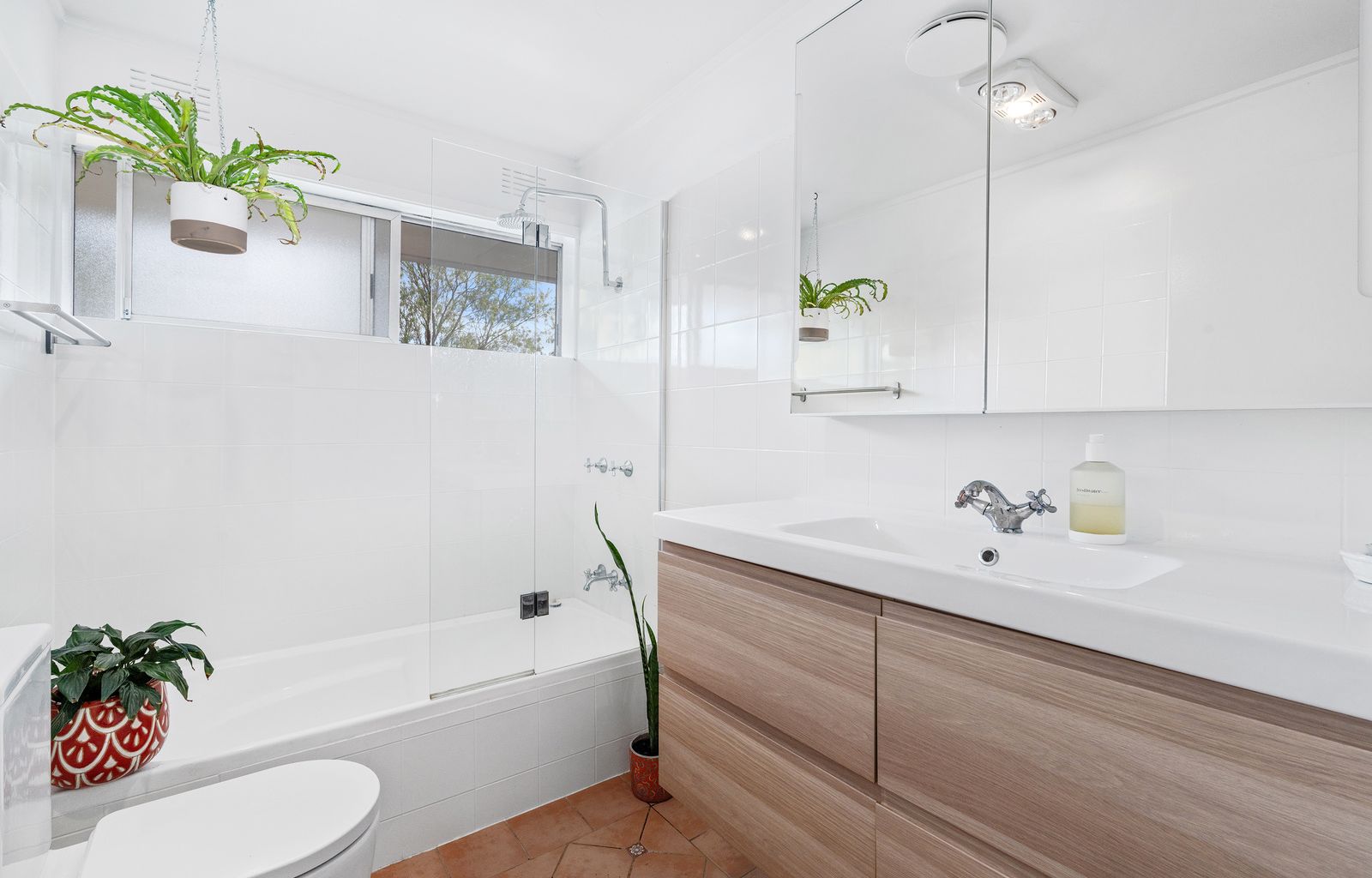 - Modern main bathroom with combined bath/shower and vanity with storage