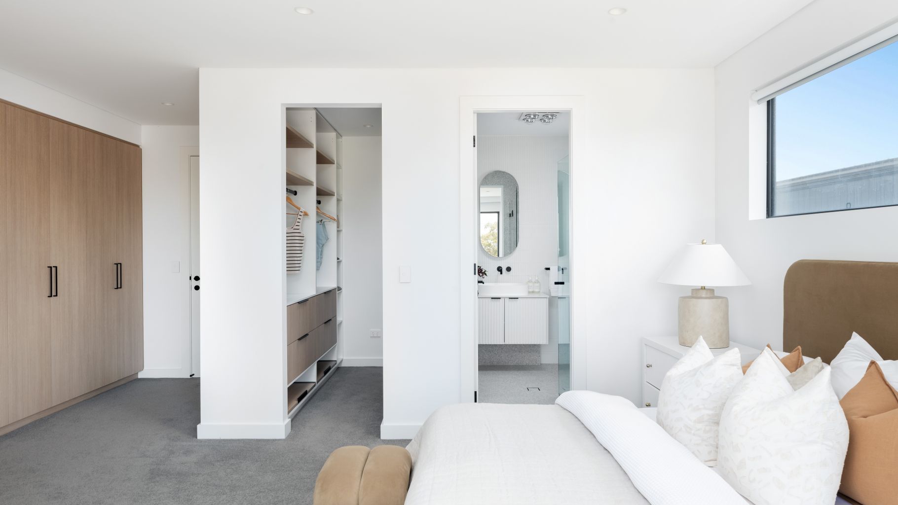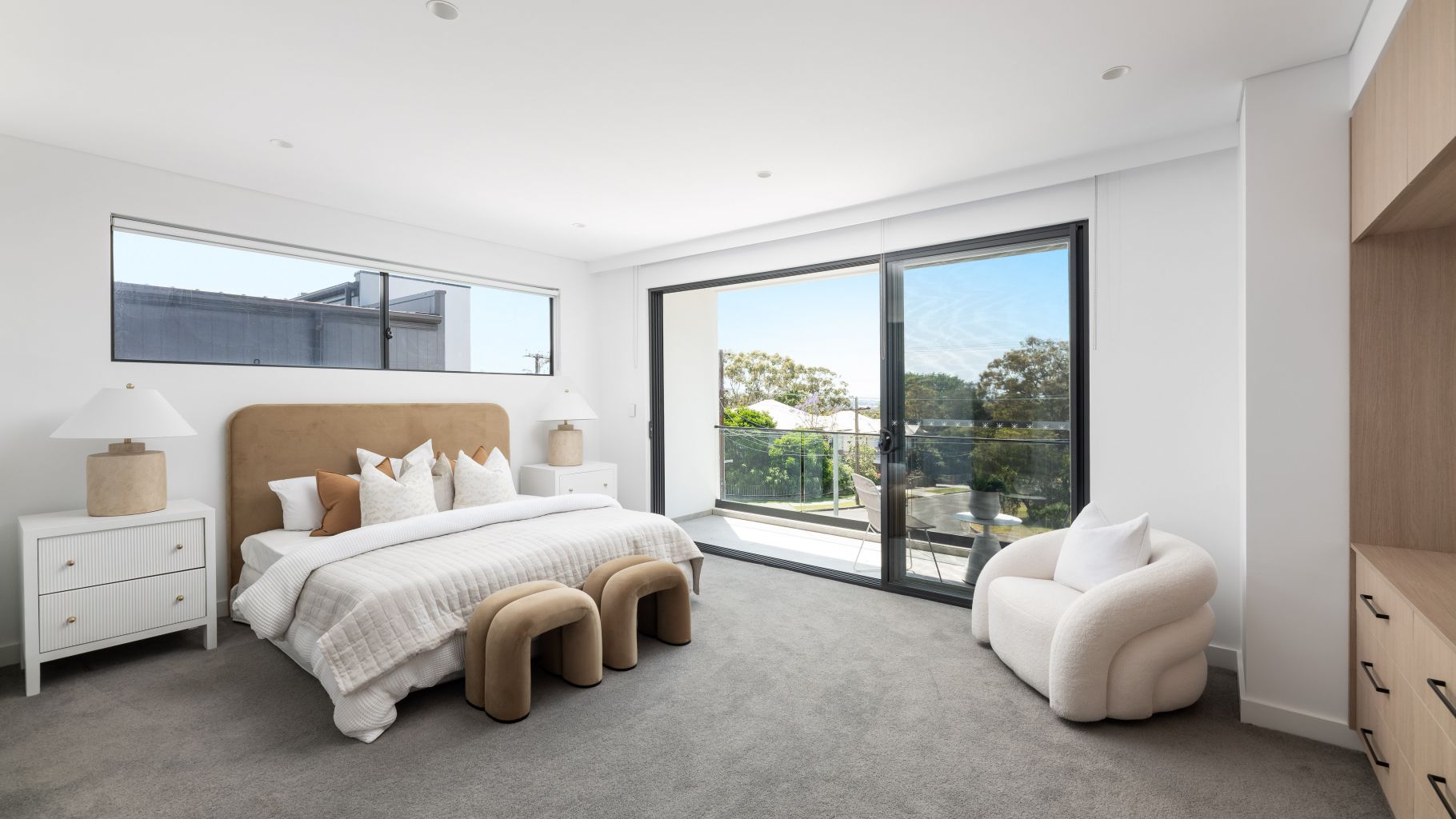 - Private master suite with its own balcony capturing distant Botany Bay water views, featuring a walk-in wardrobe, custom cabinetry and a beautifully appointed ensuite with dual shower heads, frameless glass screen and LED touch screen mirror.